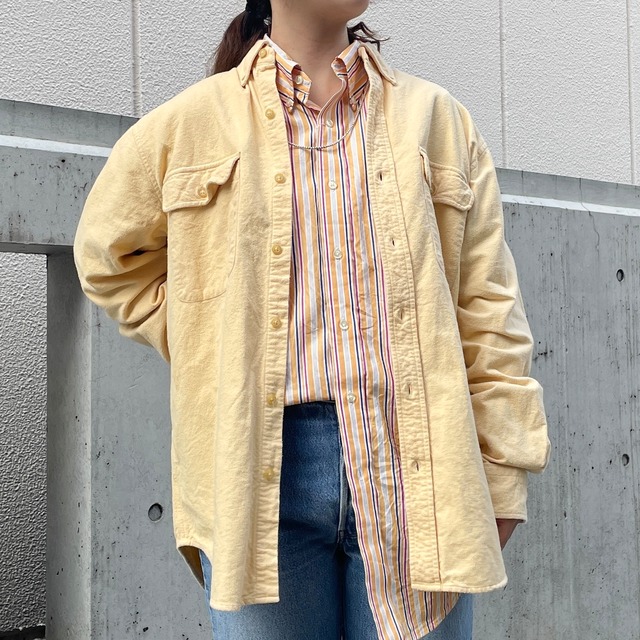 LANDS' END、80年代頃のシャモアクロスシャツ。 素材表記タグ欠損のため詳細不明ですが恐らくコットン。 ベージュカラーのシャモアクロスシャツ。 ベーシックなB.D.シャツタイプにデザイン。 起毛感のあるコットンネル素材のシャモアクロス。 素材とカラーがマッチしていて季節感を演出。 様々なスタイルに取り入れやすいアイテム。 状態は、所々に細かな汚れ。その他、経年による使用感が多少ありますが、目立った汚れやダメージはなく着用に問題はありません。 model 155cm 取扱店舗:祐天寺店 表記サイズ:- 肩幅:44.5cm 身幅:53cm 着丈:77cm 袖丈:59.5cm #2510035