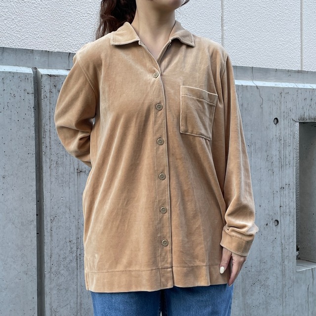 ベロアシャツ。 コットン77%、ポリエステル23%。 ベージュカラーのベロアシャツ。 ベロア特有の光沢感のある生地感が上品な印象を与えてくれます。 ゆったりとしたボックスシルエット。 季節感も演出してくるアイテム。 状態は、経年による使用感が多少ありますが、目立った汚れやダメージはなく着用に問題はありません。 model 155cm 取扱店舗:祐天寺店 表記サイズ:M 肩幅:43cm 身幅:56cm 着丈:72cm 袖丈:59cm #2410253