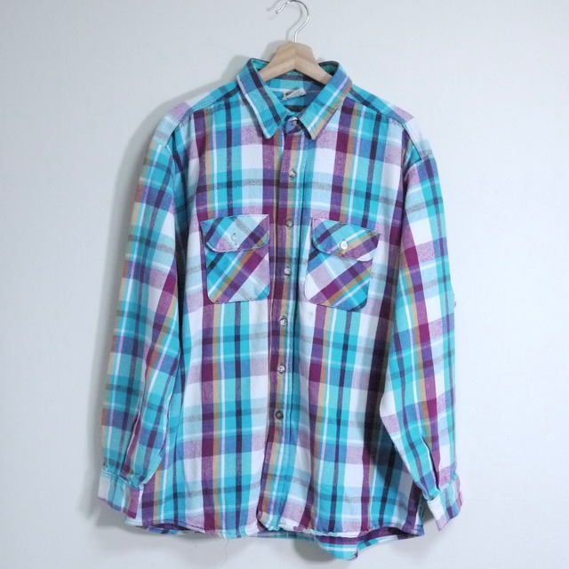FIVE BROTHER、90年代頃のネルシャツ。 素材表記タグが擦れて読み取れませんが、恐らくコットン100%。 ライトブルーやパープルのチェック柄ネルシャツ。 しっかりとした生地感でOld Outdoorらしいヘビネル。 明るめカラーの好配色。 オーバーサイズシャツとしてライトアウターのような着こなしもオススメ。 状態は、左胸ポケット下部に小さな汚れ。その他、経年による使用感が多少ありますが、目立った汚れやダメージはなく着用に問題はありません。 取扱店舗:祐天寺店 表記サイズ:2XT 肩幅:54cm 身幅:71cm 着丈:82cm 袖丈:63cm #2602015