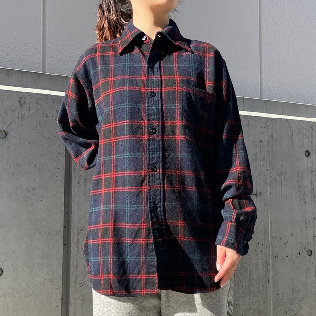 PENDLETON、70年代頃のウールシャツ。 アメリカ製。ウール100%。 ネイビーカラーがベースのチェック柄ウールシャツ。 好配色なブラック、グリーン、レッドで上品な印象。 季節感も演出してくれます。 オーバーサイズシャツとして様々なスタイルに取り入れやすいアイテム。 状態は、前身頃の左裾付近と襟の後ろ側にピンホール。その他、経年による使用感が多少ありますが、目立った汚れやダメージはなく着用に問題はありません。 model 155cm 取扱店舗:祐天寺店 表記サイズ:M 肩幅:46cm 身幅:59cm 着丈:78cm 袖丈:58.5cm #2512224
