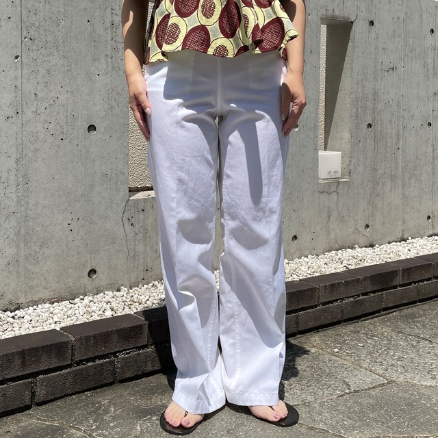 French Navy、60~70年代頃のセーラーパンツ。 素材表記がありませんが恐らくコットンかと思われます。 ホワイトカラーのセーラーパンツ。 しっかりとした生地感で後ろ側にタックの入る腰回りのゆったりとした仕様。 6ボタンの前開きタイプがマリンテイストなデザインでタックインスタイルも上品な印象に。 ホワイトカラーのワイドシルエットでこれからの季節にオススメ。 取り入れやすいミリタリーアイテム。 状態は、全体的に経年による使用感は多少ありますが、目立った汚れやダメージはなく着用に問題はありません。 model 149cm,155cm 取扱店舗:祐天寺店 表記サイズ:72C ウエスト:70cm 股上:23.5cm 股下:75cm 裾幅:24cm #2407277