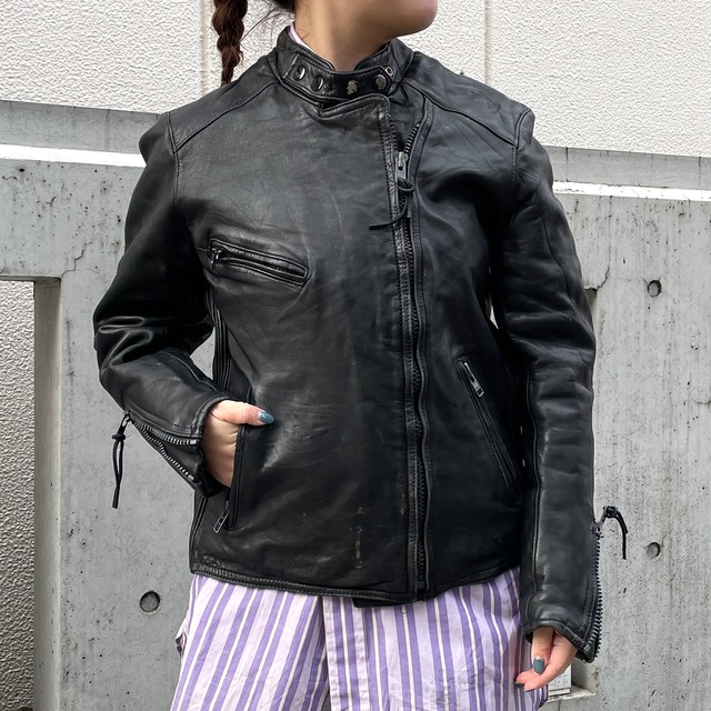 レザージャケット。 混率の表記はありませんが、素材はレザー。 ブラックカラーのレザージャケット。 スタンドカラーのライダースタイプ。 コンパクトなサイズ感でシンプルなデザイン。 女性らしいアイテムとの相性もよく、取り入れやすいアイテム。 状態は、所々にスレや細かな汚れ。その他、全体的に経年による使用感は多少ありますが、目立ったダメージや汚れはなく着用に問題はありません。 model 155cm 取扱店舗:祐天寺店 表記サイズ:40 肩幅:42cm 身幅:52cm 着丈:56cm 袖丈:57.5cm #2602215