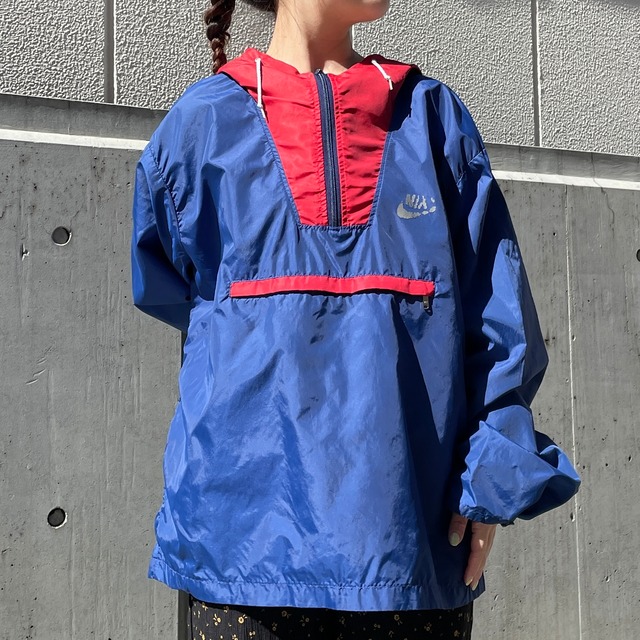 NIKE、70年代頃のナイロンジャケット。 オレンジタグ。アメリカ製。ナイロン100%。 ブルーカラーのナイロンジャケット。 プルオーバーのアノラックスタイル。 左胸にスウォッシュロゴのプリントデザイン。 落ち着いたレッドカラーの切り返しデザインがアクセントになっています。 裏地が付かず軽い生地感。 お腹のポケットに収納することができるので持ち運びにも便利。 ライトアウターとしてこれからの季節にオススメ。 状態は、裾にリペア。その他、経年による使用感はありますが、着用に問題はありません。 model 155cm 取扱店舗:祐天寺店 表記サイズ:XL 肩幅:54cm 身幅:67cm 着丈:69cm 袖丈:63cm #2603021