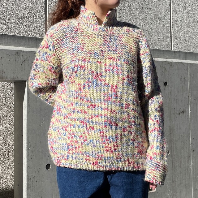 セーター(ニット)。 ウール52%、アクリル48%。 ホワイトカラーがベースのニット。 ハイネックがデザインのアクセントになっています。 カラフルな糸が全体的に使われていて総柄デザインのようになっています。 シンプルなデザインの網目で合わせやすいアイテム。 しっかりとしていて肌触りの良い生地感。 状態は、全体的に経年による使用感が多少ありますが、目立った汚れやダメージはなく着用に問題はありません。 model 155cm 取扱店舗:祐天寺店 表記サイズ:M 肩幅:43cm 身幅:55cm 着丈:58cm 袖丈:65cm #2511245