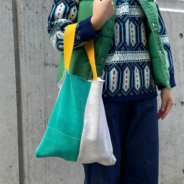 【こちらの商品はリメイクアイテムです】 スウェットトートバッグ。 好配色な異なるREVERSE WEAVEの生地によるパッチワークデザイン。 ハンドル部分も同様に複数の生地にて制作しています。 MacBookが入る使い勝手の良いサイズ感。 ハンドバッグタイプの短めのハンドル。 収納口は切りっぱなしデザイン。ステッチを入れていますので、大きくほつれてくることはありません。 ハンドルは複数のステッチを入れることで強化し使いやすくしています。 リメイク制作時やリペアの際に発生する残布で制作した、サステナブルなアイテム。 状態は、Vintageファブリックを使用していますので、経年による使用感はありますが、目立った汚れやダメージはなく使用に問題はありません。 model 155cm 取扱店舗:ONLINE STORE 高さ:32cm 幅:30cm ハンドルの高さ:34cm #2512032