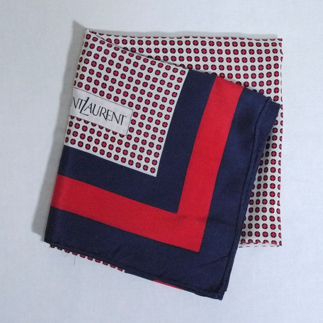YVES SAINT LAURENTのスカーフ。 品質表示タグ欠損のため素材は不明ですが、シルクのような生地感です。 縁の部分がハンドロールド(巻かれて手縫いで処理)。 60年代以前のヴィンテージスカーフで品質の良いシルクスカーフに用いられていたディテールですが、こちらの商品の詳しい年代は不明です。 ネイビー×レッドのドット柄デザイン。 デザイン性のあるドット柄。 合わせやすい好配色。 様々な使い方のできる大きいサイズ。 状態は、汚れが1ヶ所。その他、経年による使用感は多少ありますが、目立ったダメージや汚れはなく使用に問題はありません。 取扱店舗:祐天寺店 サイズ:77cm×75cm #25072212