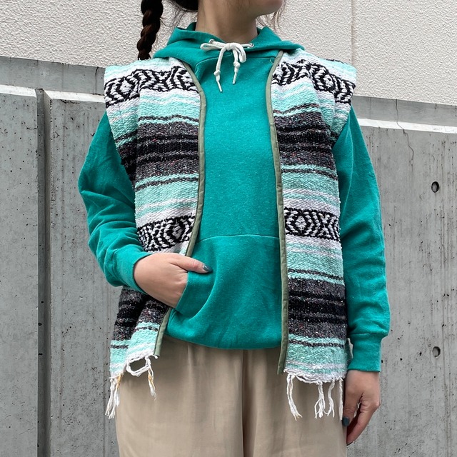 【こちらの商品はリメイクアイテムです】 メキシカンラグで制作したベスト。 素材は恐らくコットン。 グリーンカラーがベースの好配色なボーダー柄。 活用したフリンジやパイピングがデザインのアクセントになっています。 裏地を付けて着やすさも考慮。 メキシカンラグをベストへアップサイクル。 状態は、経年による多少の使用感はありますが、目立った汚れやダメージはなく着用に問題はありません。 model 155cm 取扱店舗:祐天寺店 肩幅:44cm 身幅:49cm 着丈:66cm(フリンジ含む) #2602117