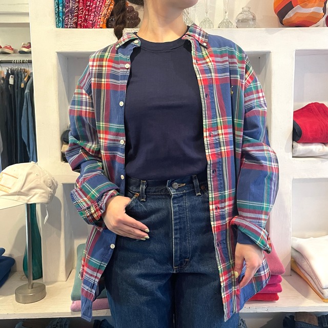 Ralph Lauren、90年代頃のB.D.シャツ。 コットン100%。 ブルーカラーがベースのチェック柄B.D.シャツ。 胸にロゴ刺繍が入る定番デザイン。 レッドカラーがアクセントになっているチェック柄。 オーバーサイズシャツとして様々なスタイルに取り入れやすいアイテム。 状態は、経年による使用感が多少ありますが、目立った汚れやダメージはなく着用に問題はありません。 model 155cm 取扱店舗:祐天寺店 表記サイズ:L 肩幅:50cm 身幅:60cm 着丈:81cm 袖丈:67cm #2603242