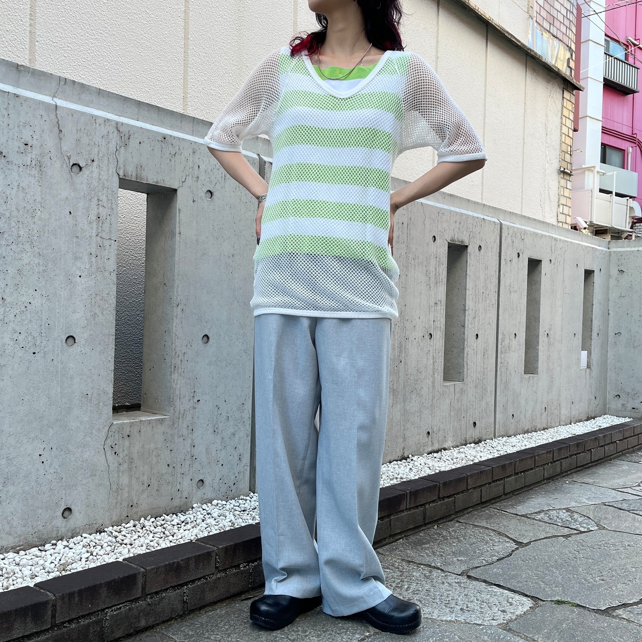 ライトグレーカラーのスラックスパンツ。