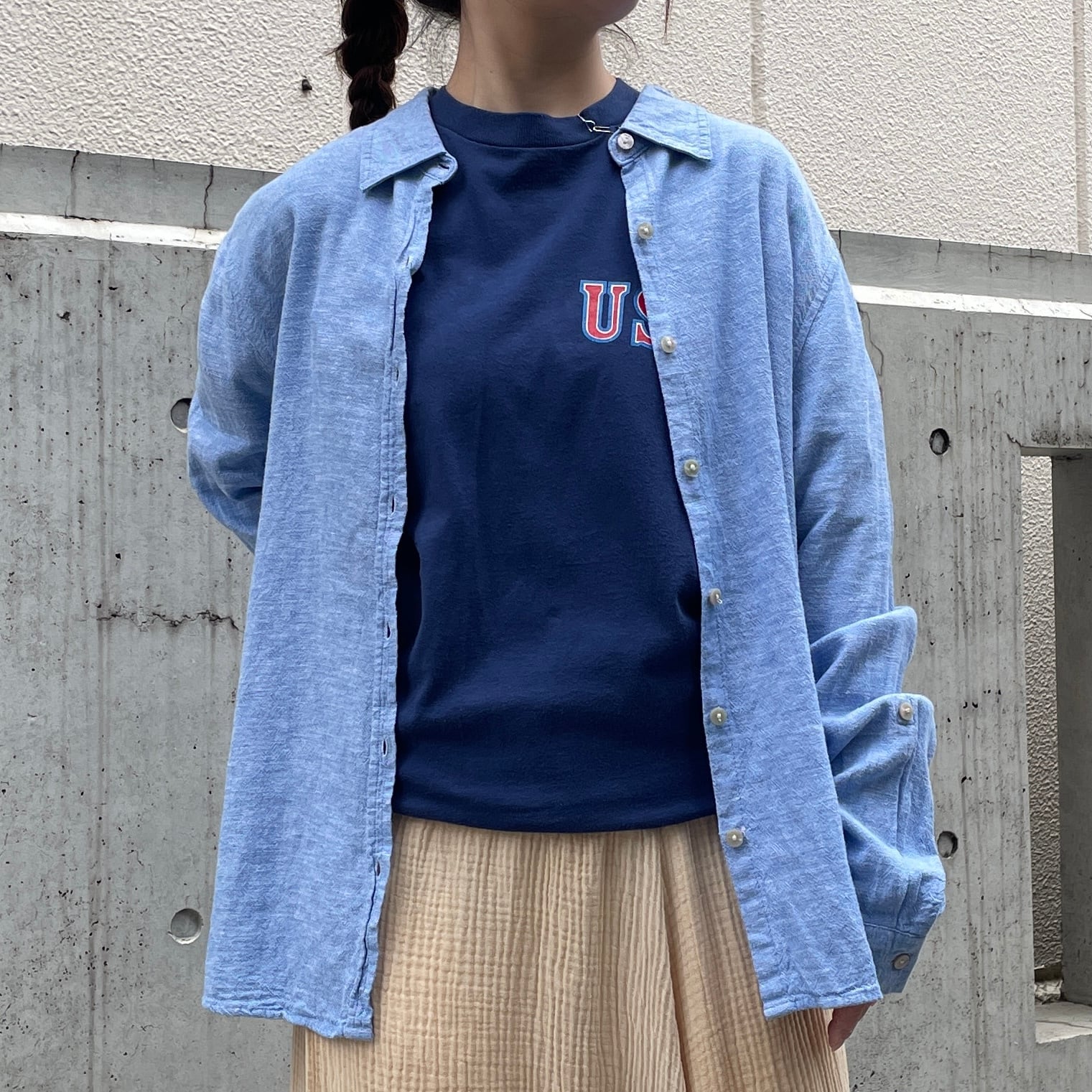 ライトブルーカラーのリネンシャツ。
