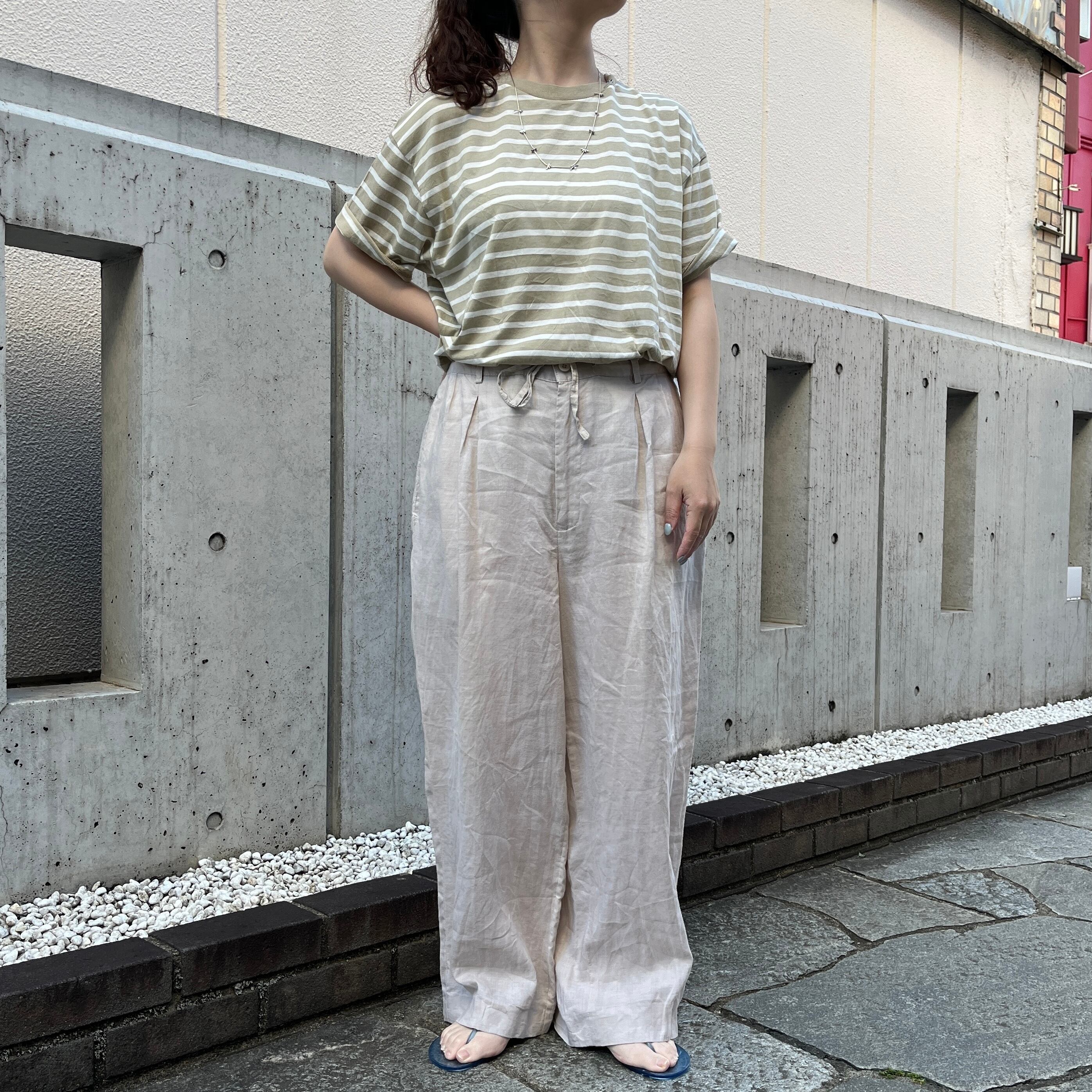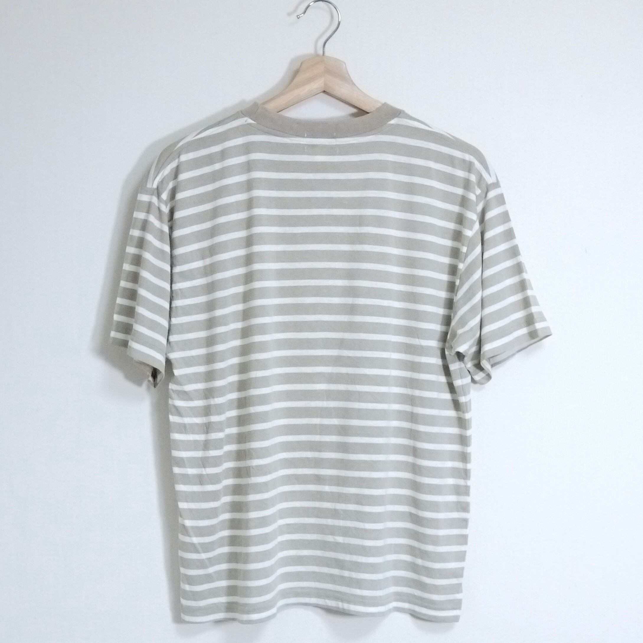 ライトベージュ×ホワイトのボーダー柄Tシャツ。