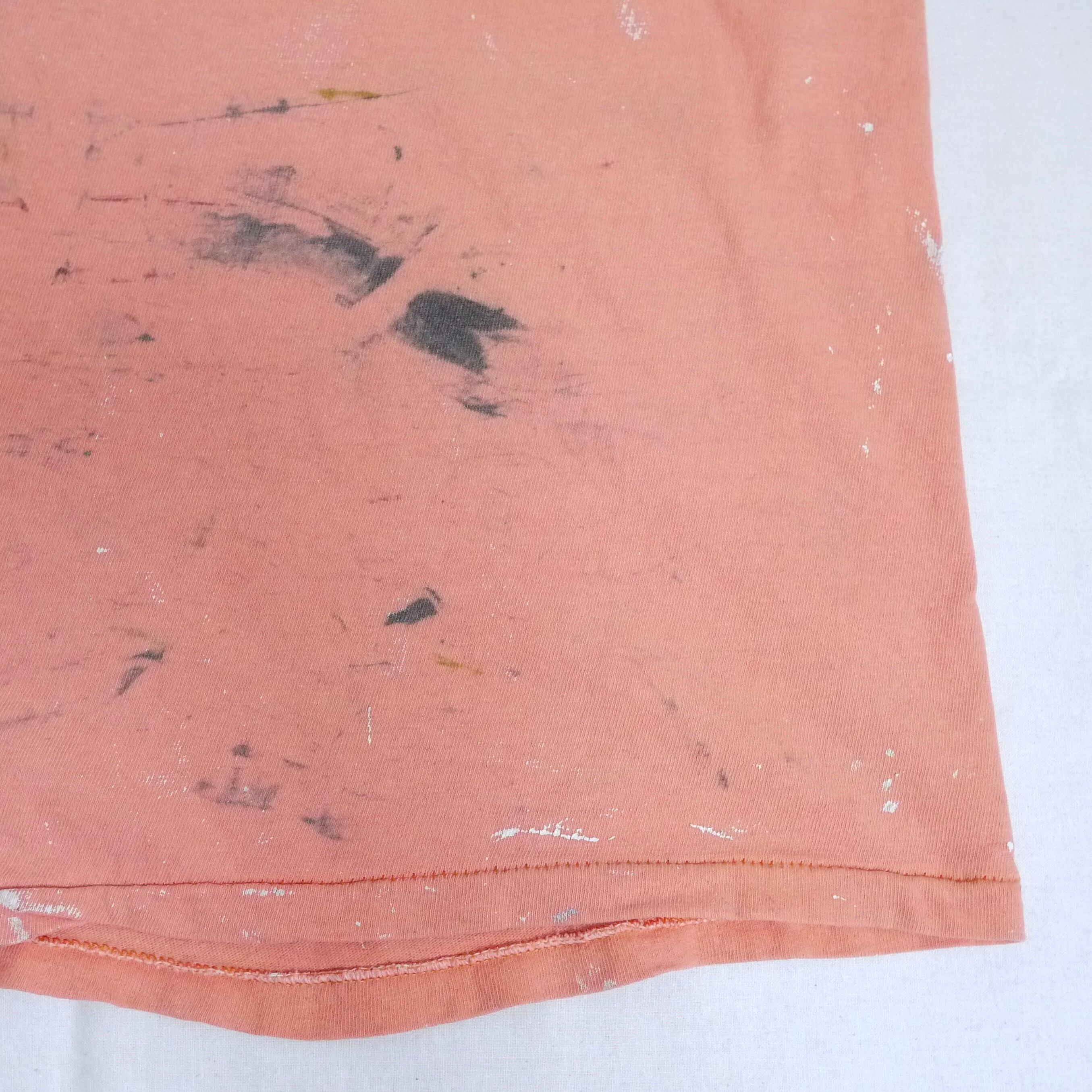 落ち着いたピンクカラーのボディーと好配色なプリント、全体に飛んだペンキや汚れがマッチしていて雰囲気のあるアイテム。