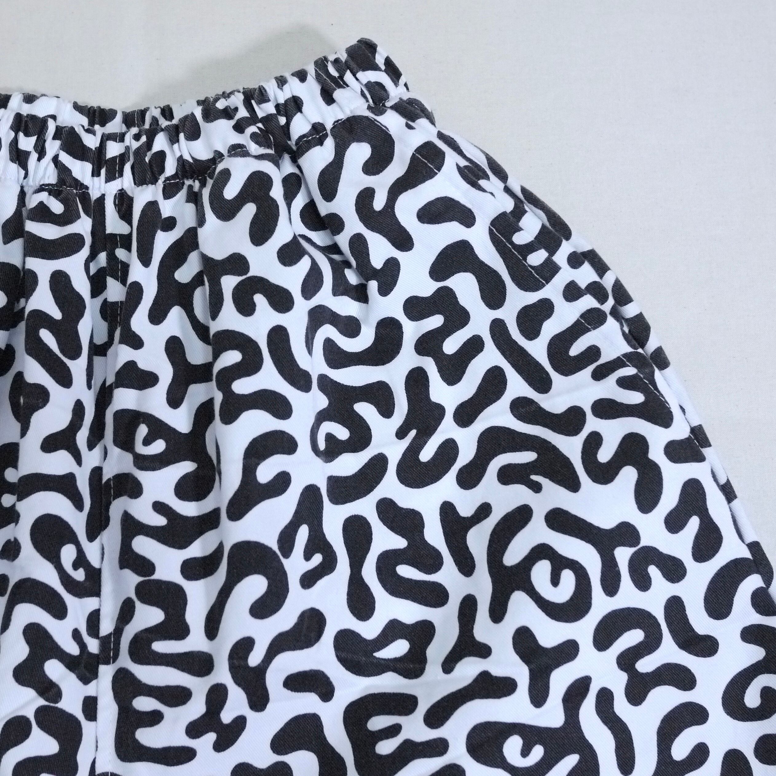 ホワイト×ブラックの総柄パンツ。