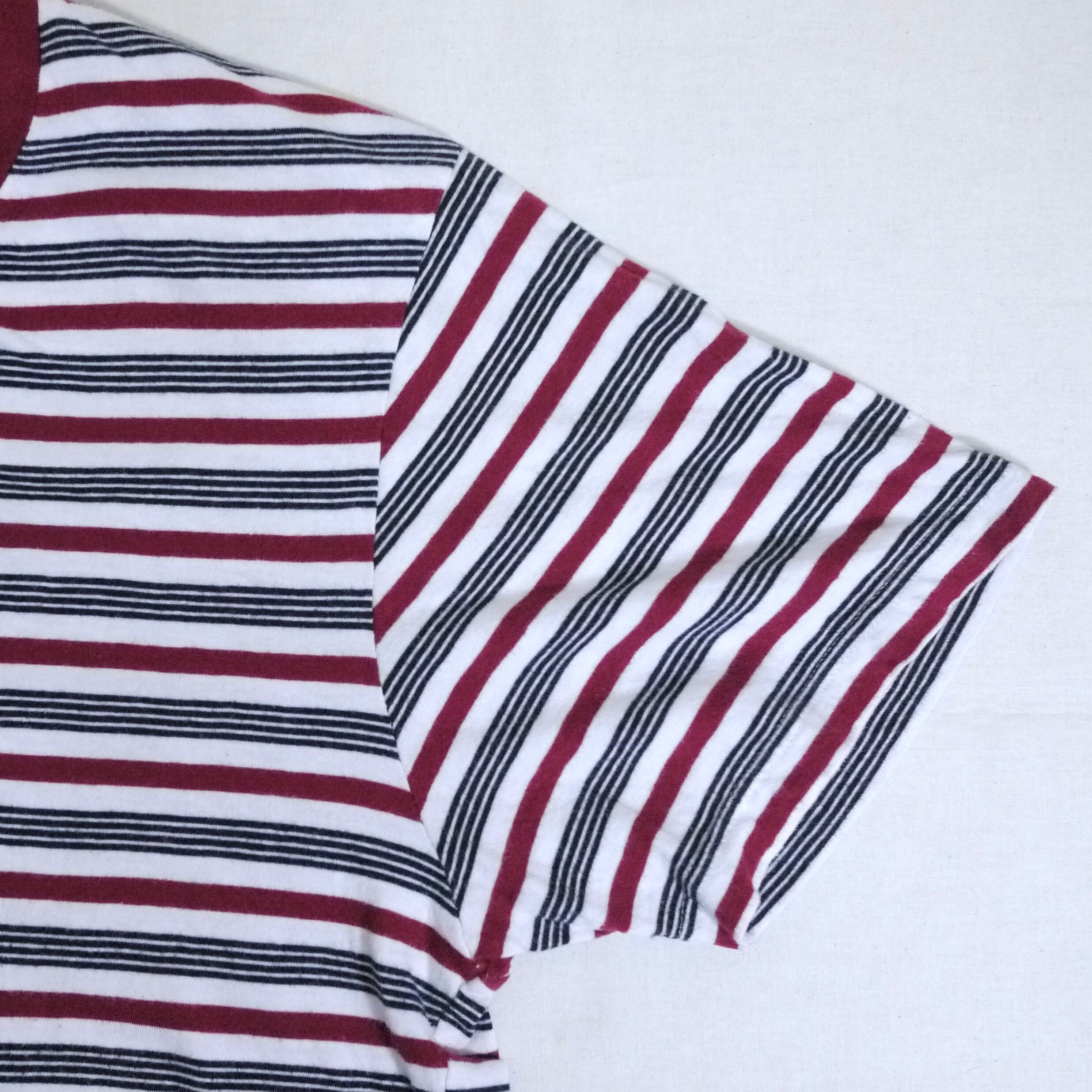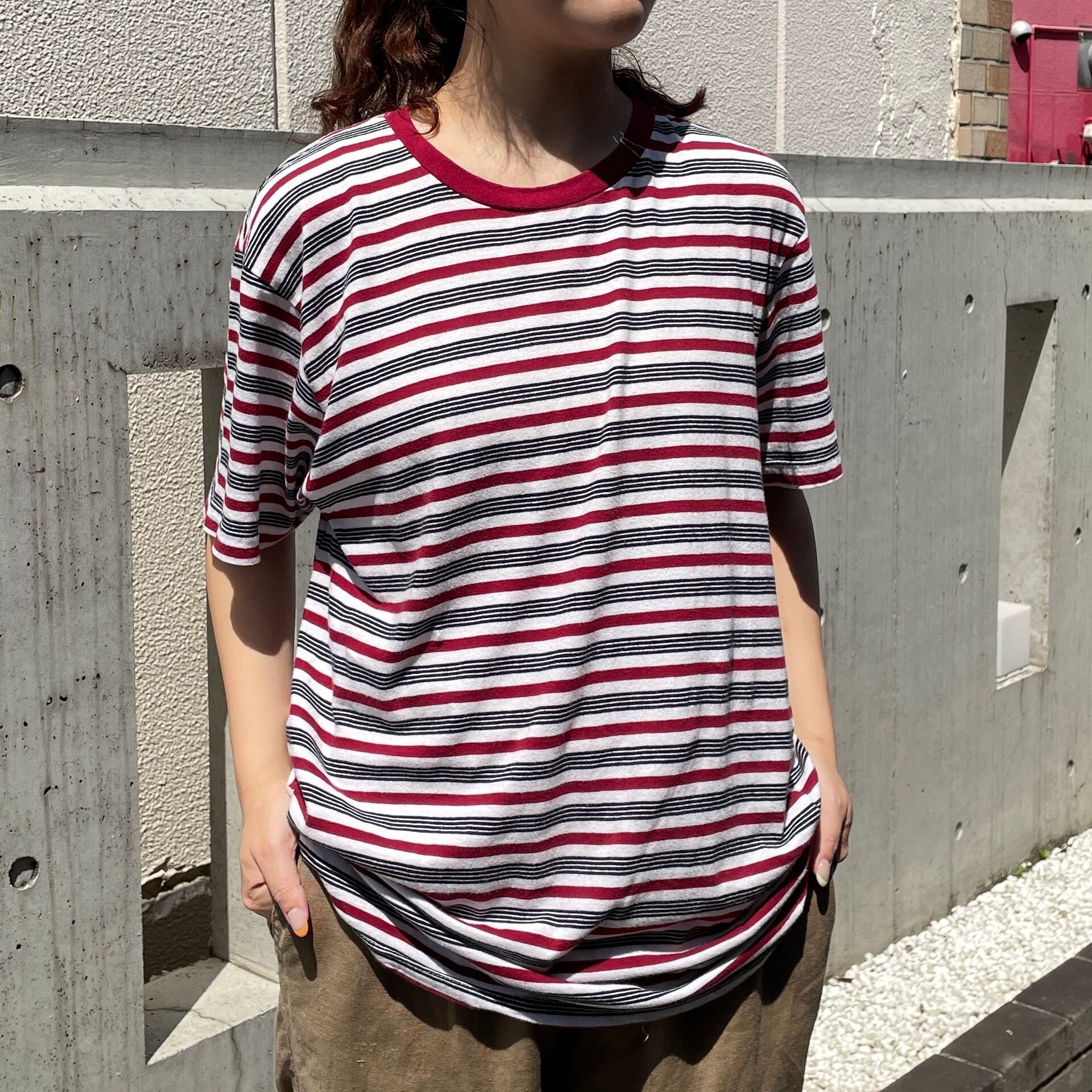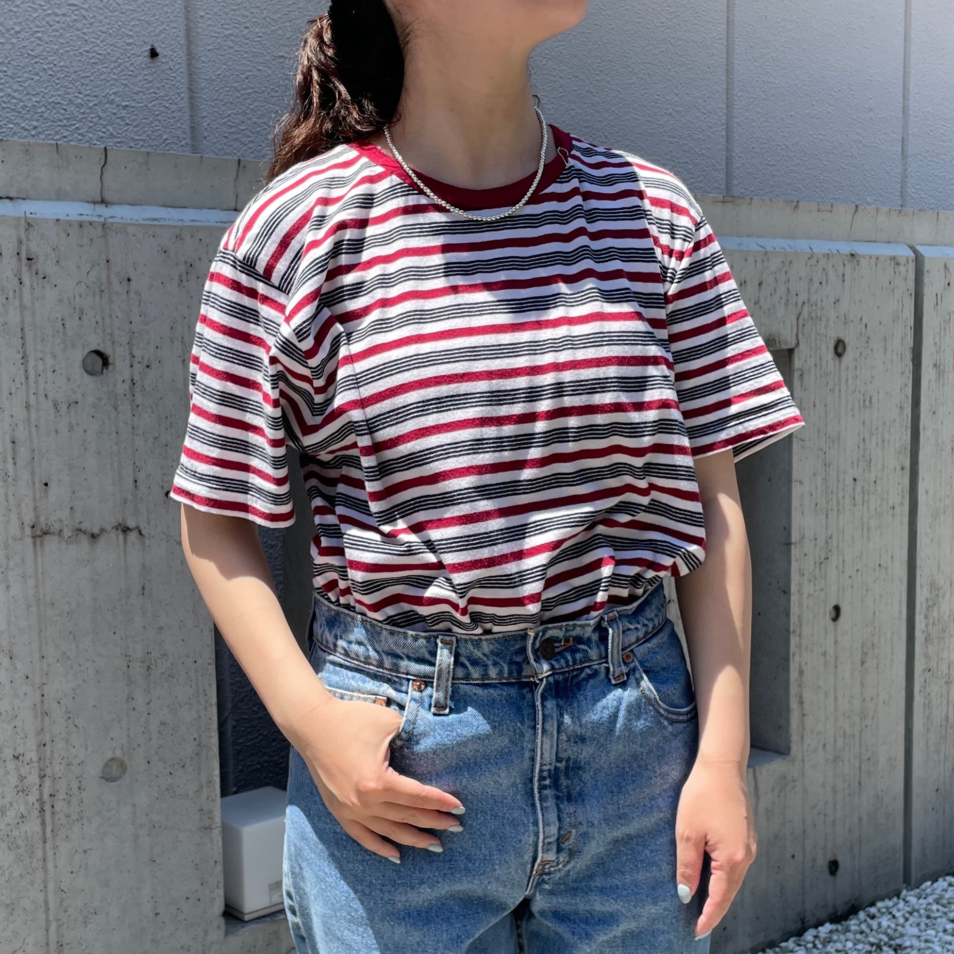 ホワイト、ブラック、レッドのボーダー柄Tシャツ。