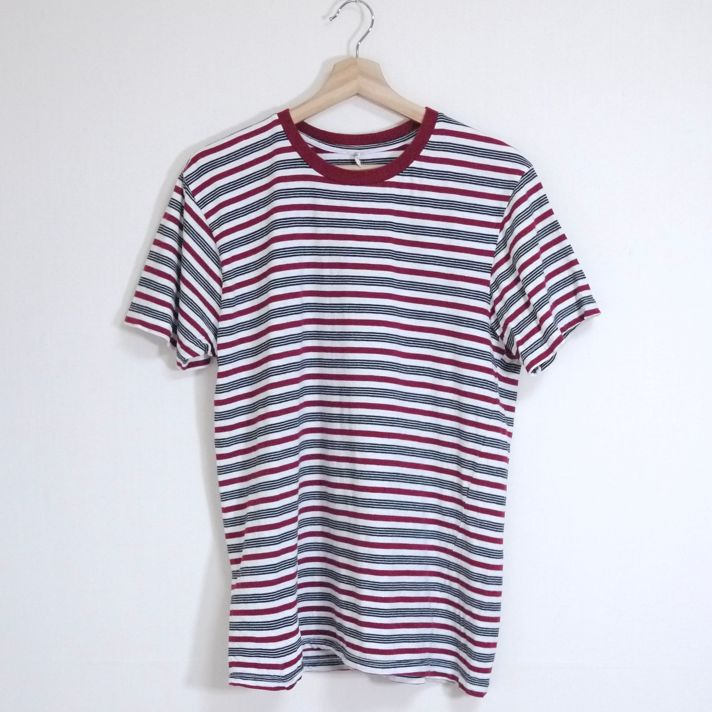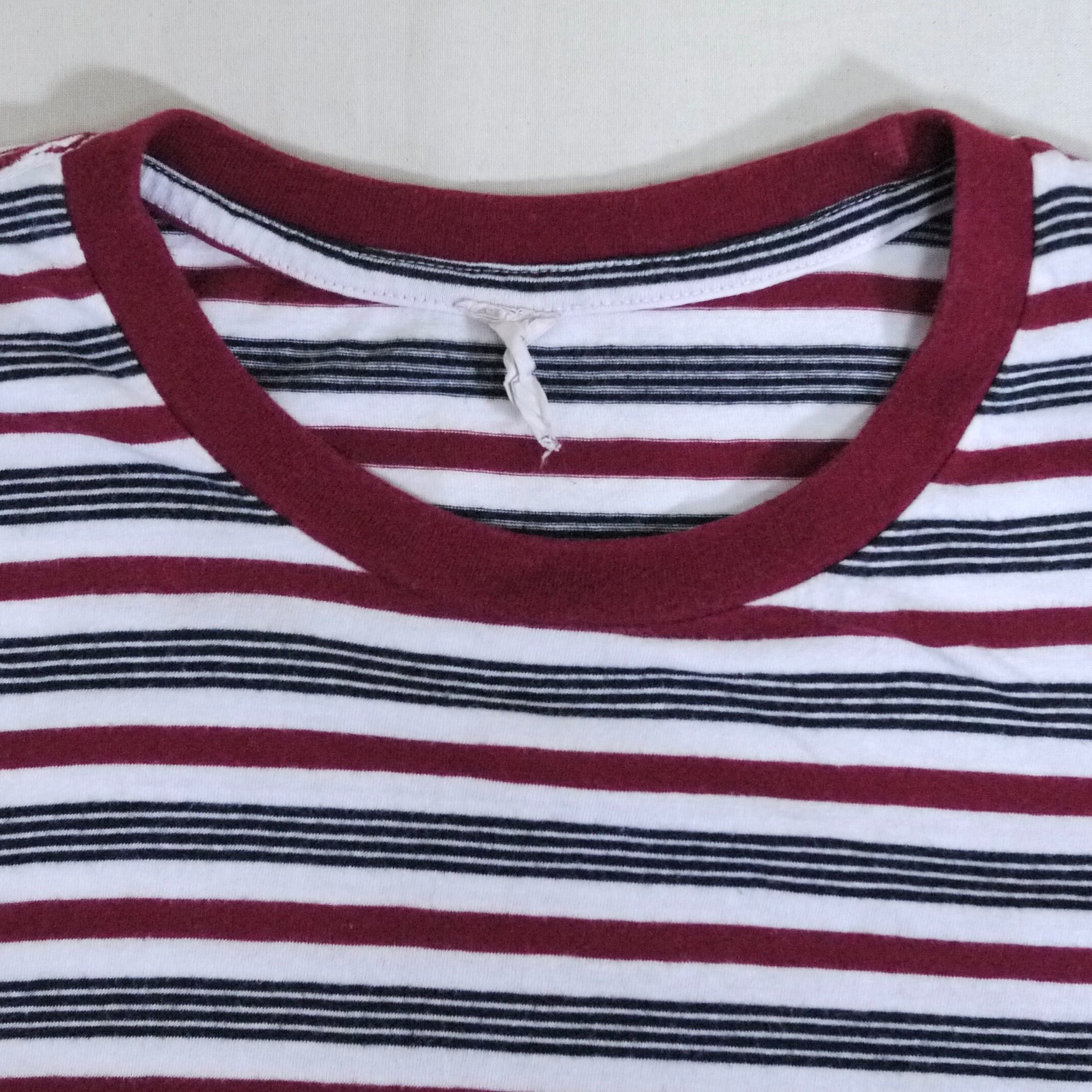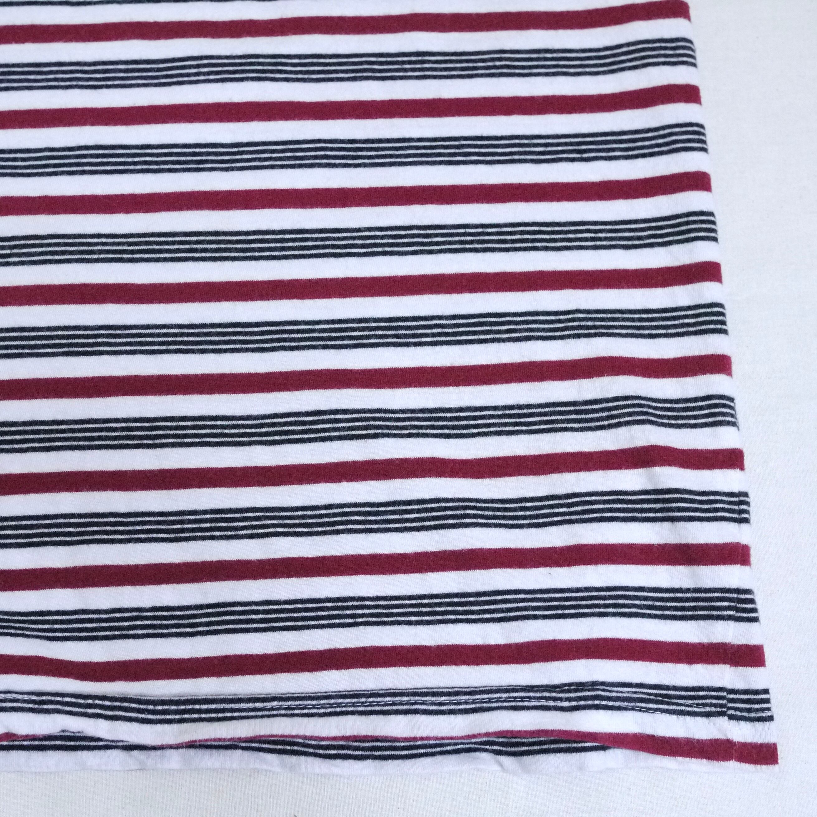 ホワイト、ブラック、レッドのボーダー柄Tシャツ。
