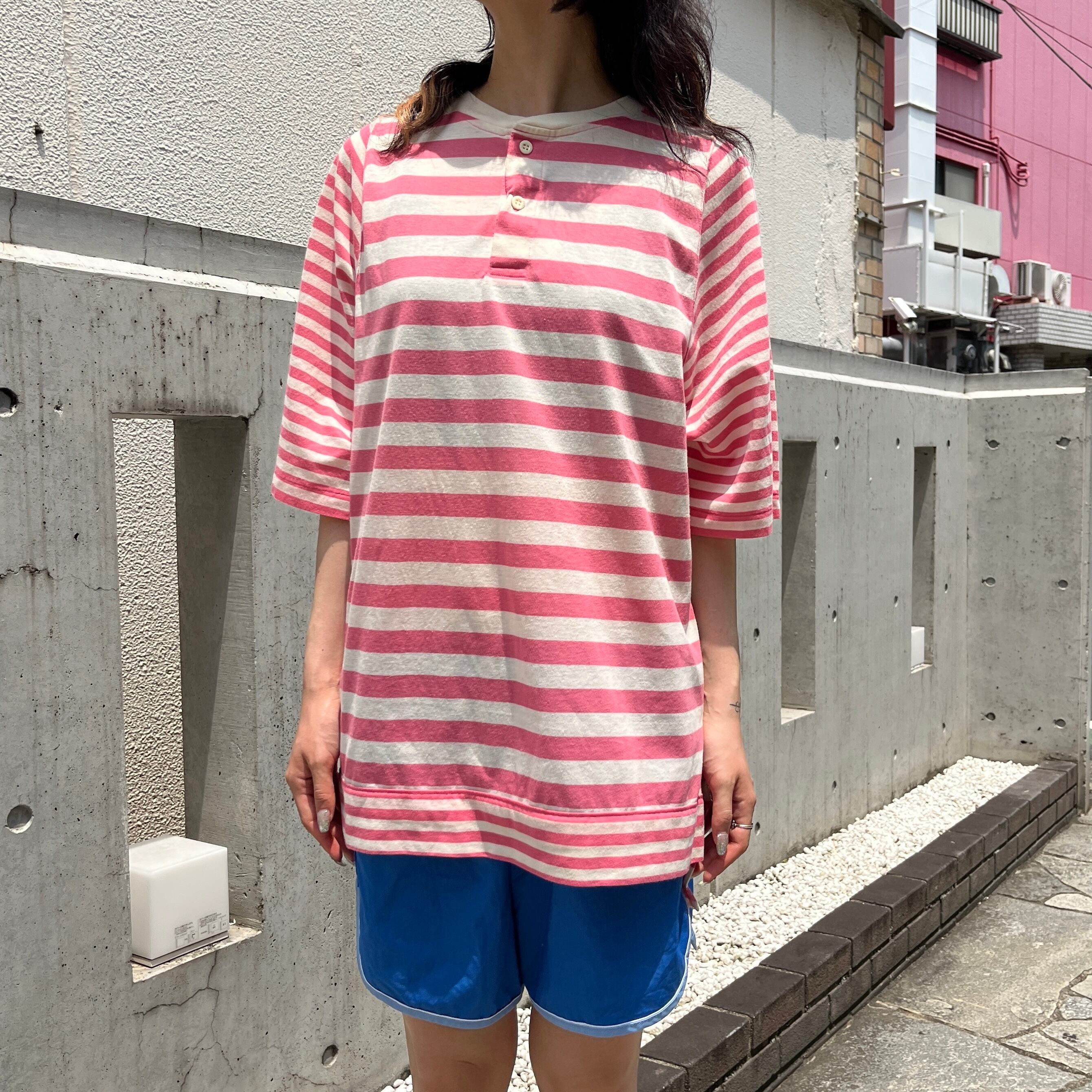 ピンク×ホワイトのボーダー柄Tシャツ。