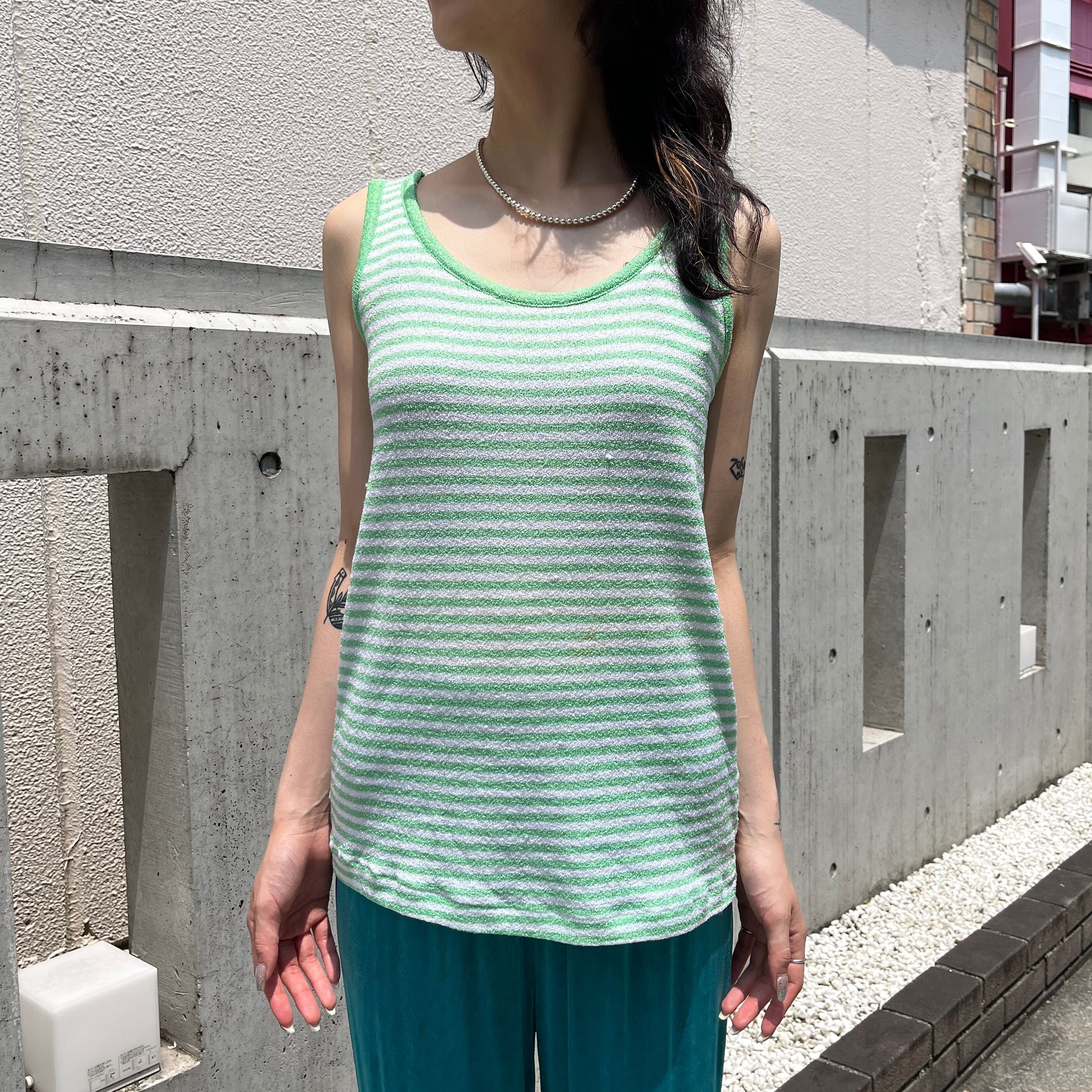 グリーン×ホワイトのボーダー柄トップス。