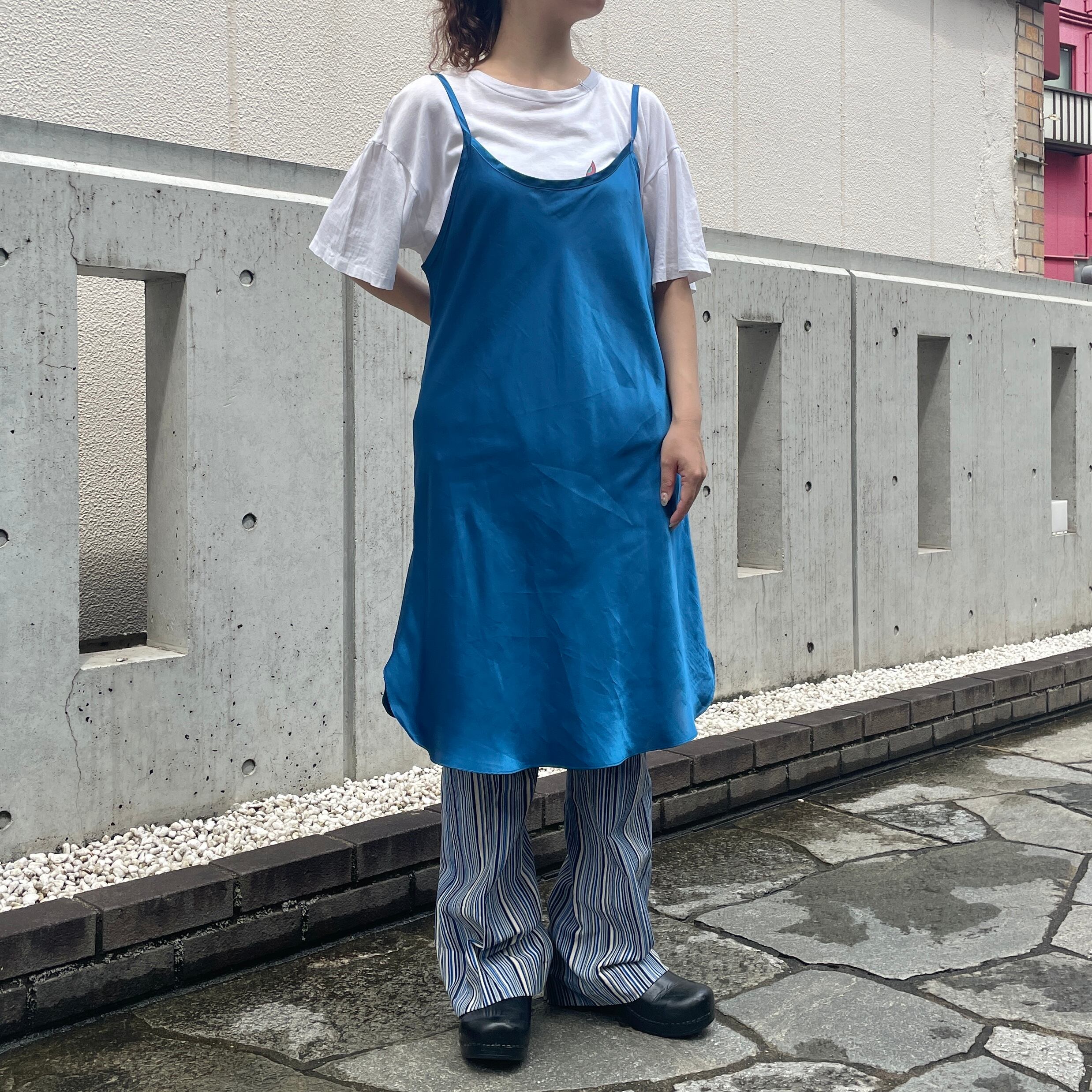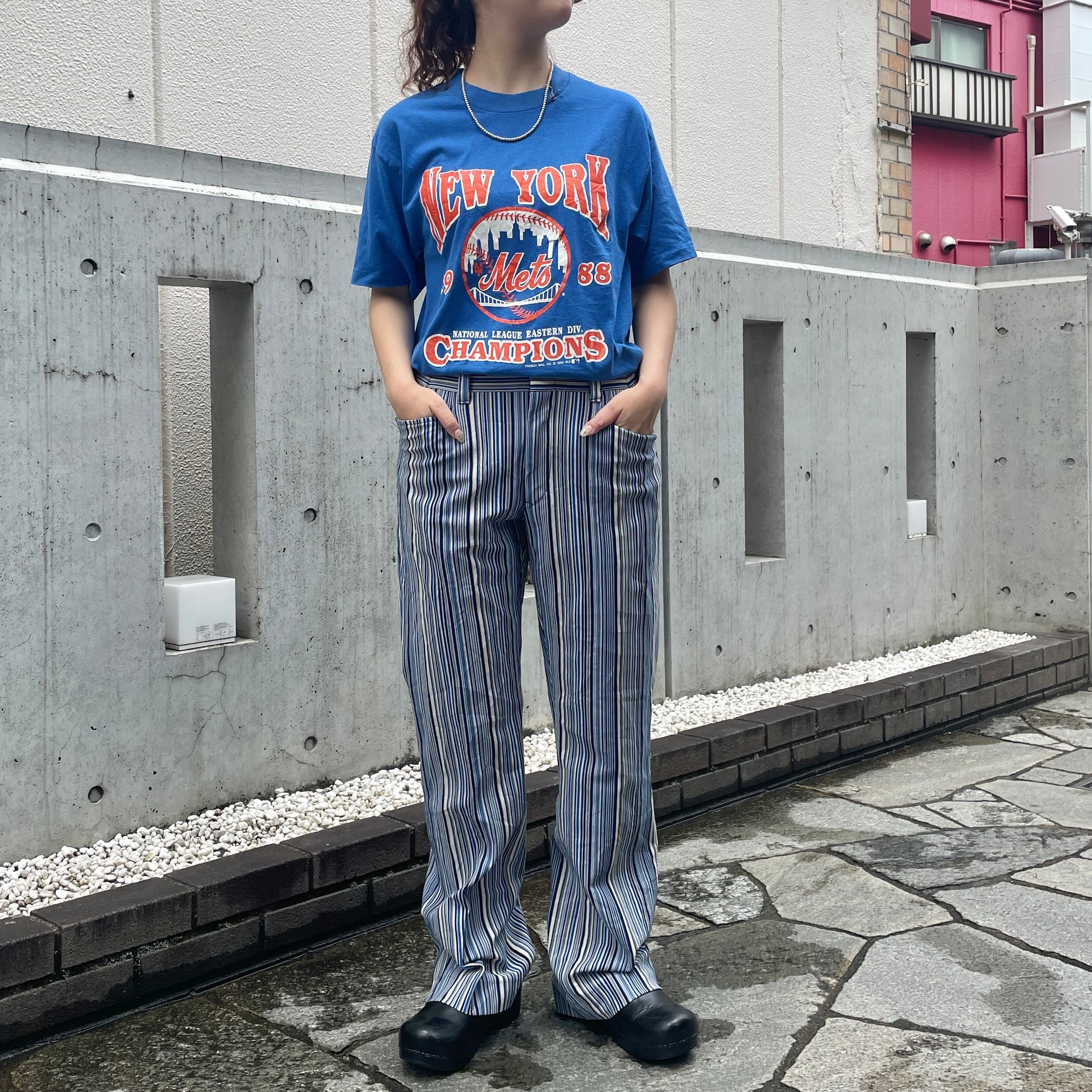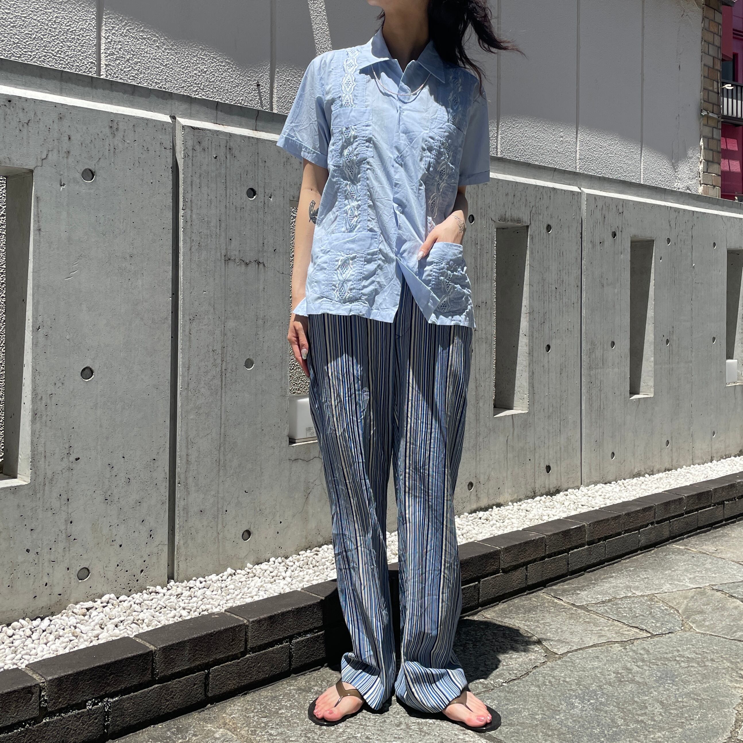 ブルーカラーのストライプ柄スラックスパンツ。