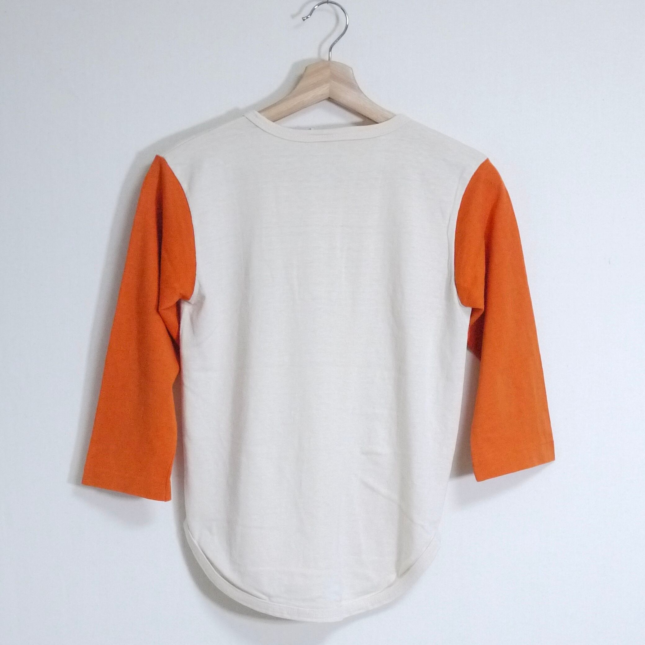 ホワイト×オレンジのベースボールTシャツ。