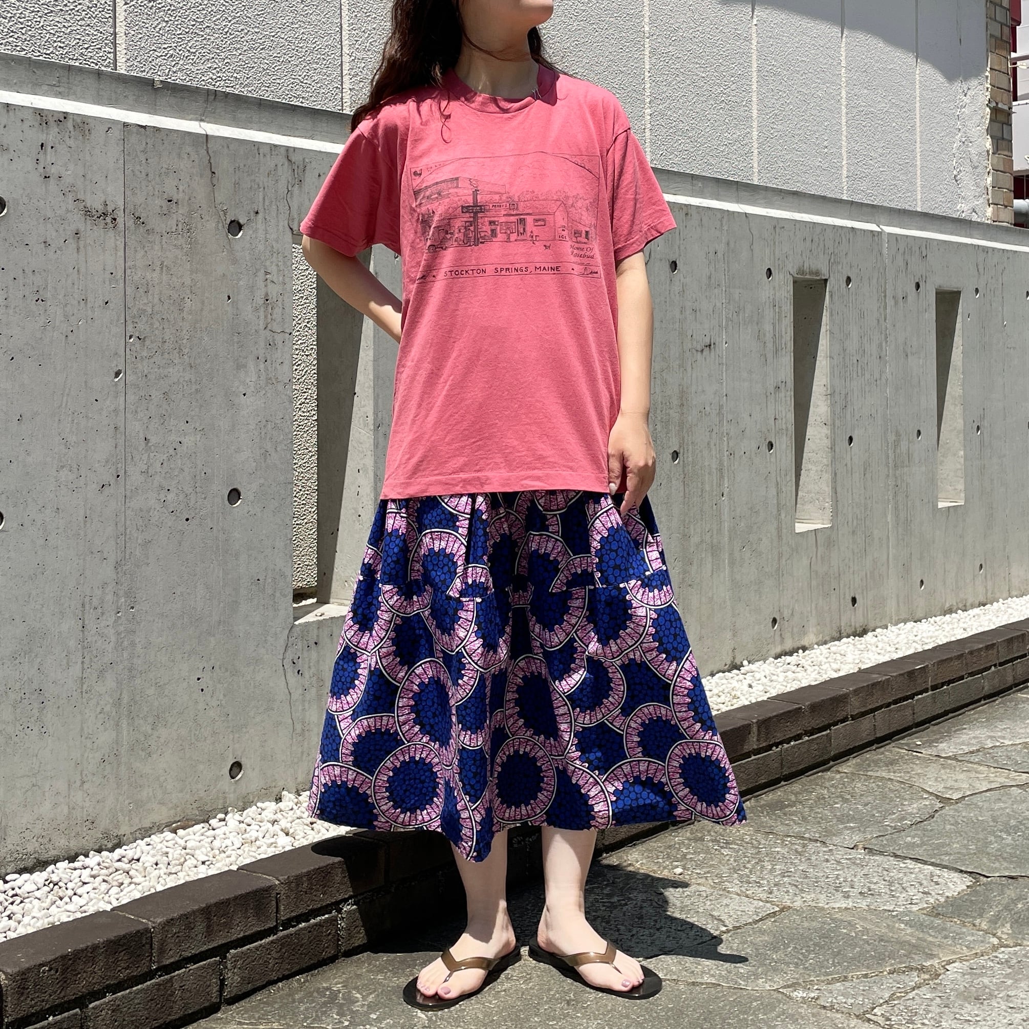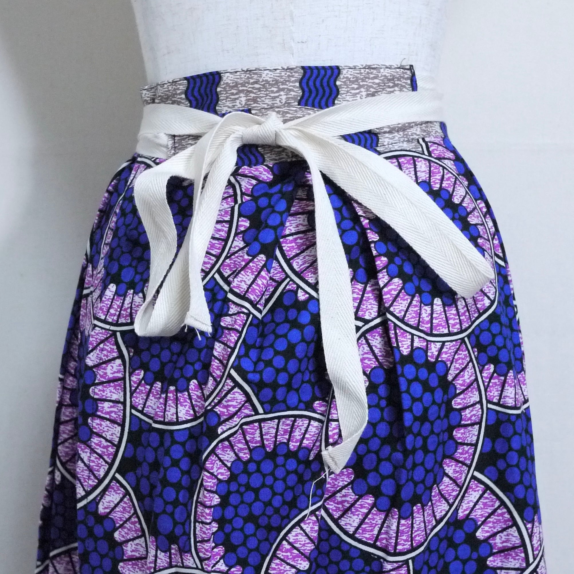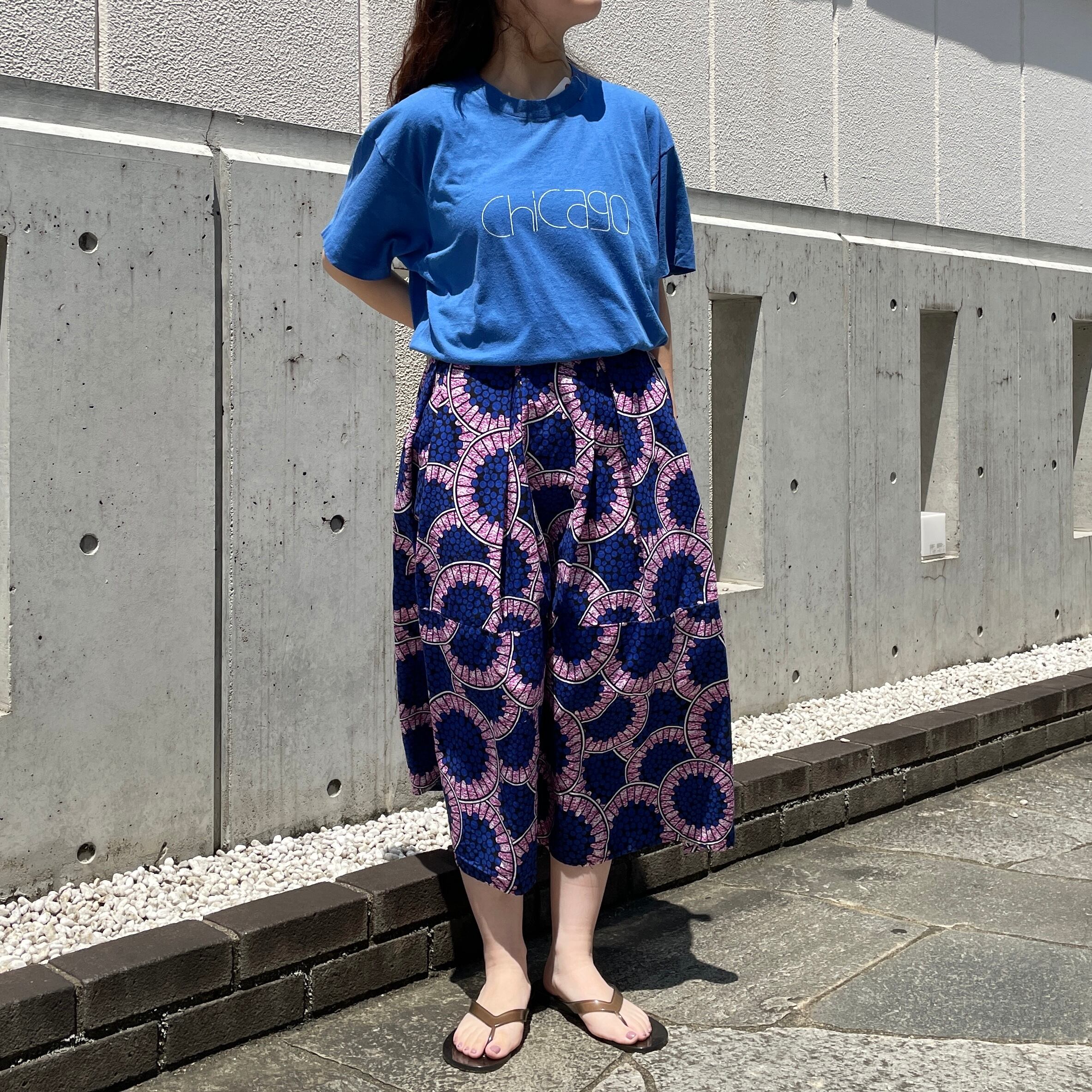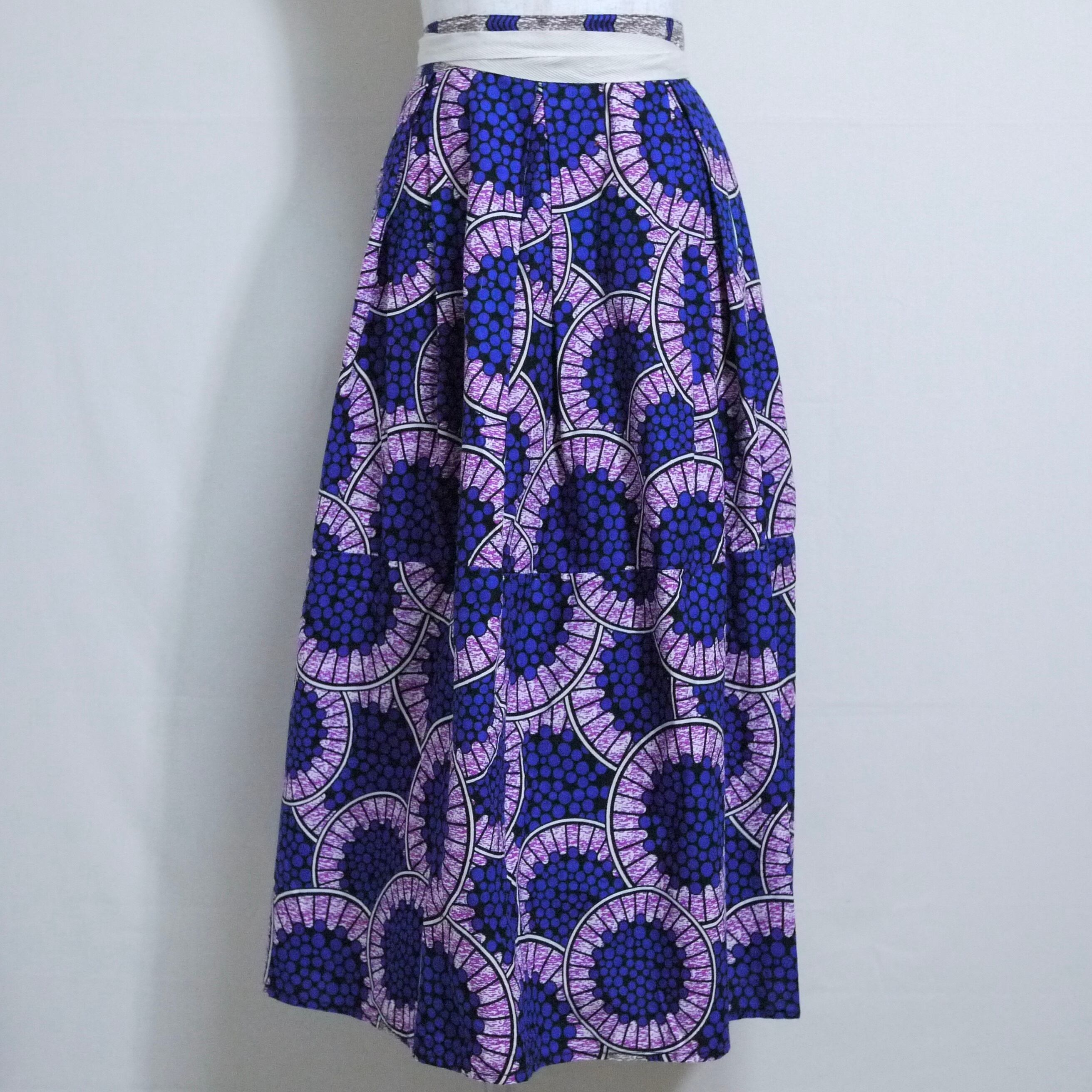 ロングワンピースをスカートへアップサイクルしているため、同生地のパッチワークのようなデザインになっています。