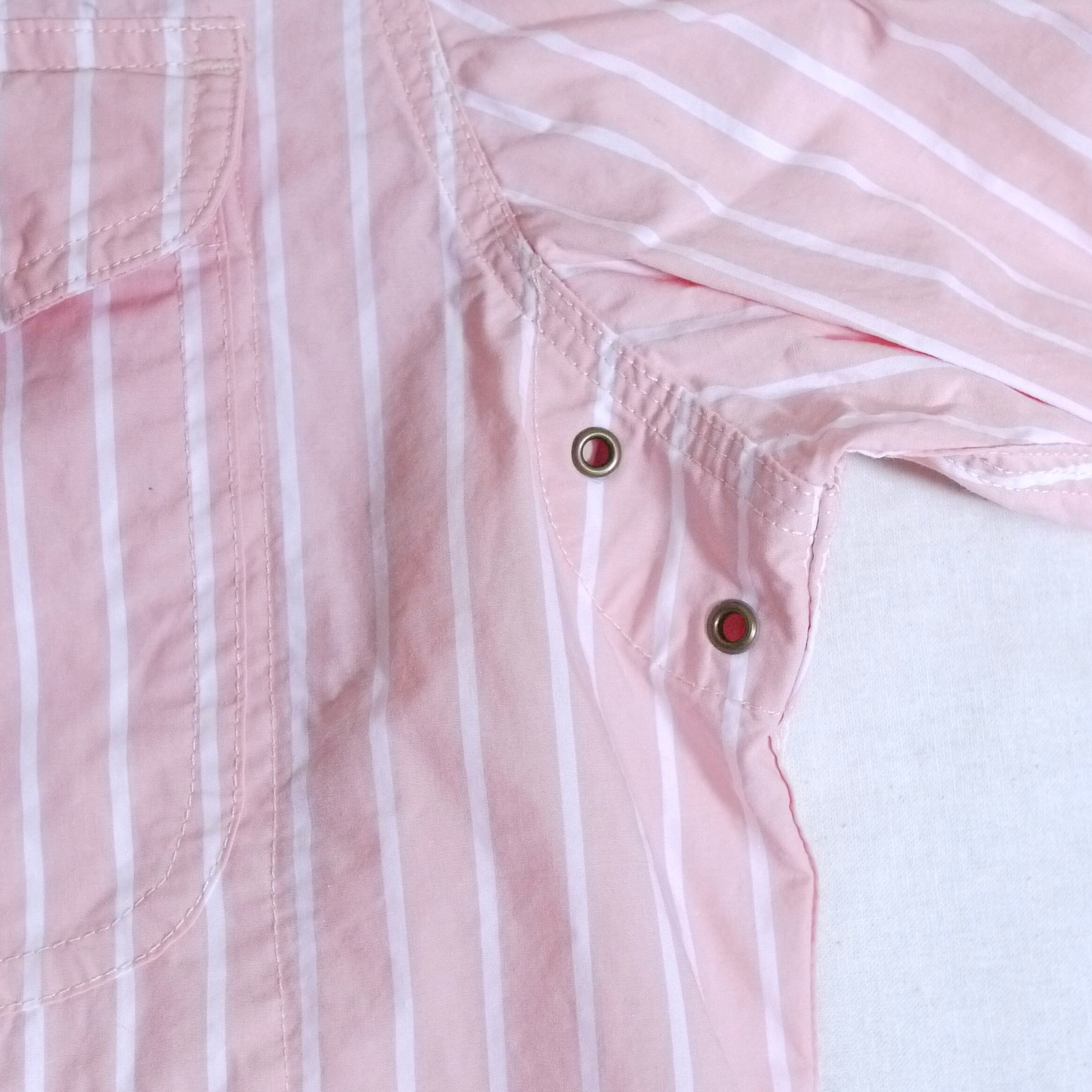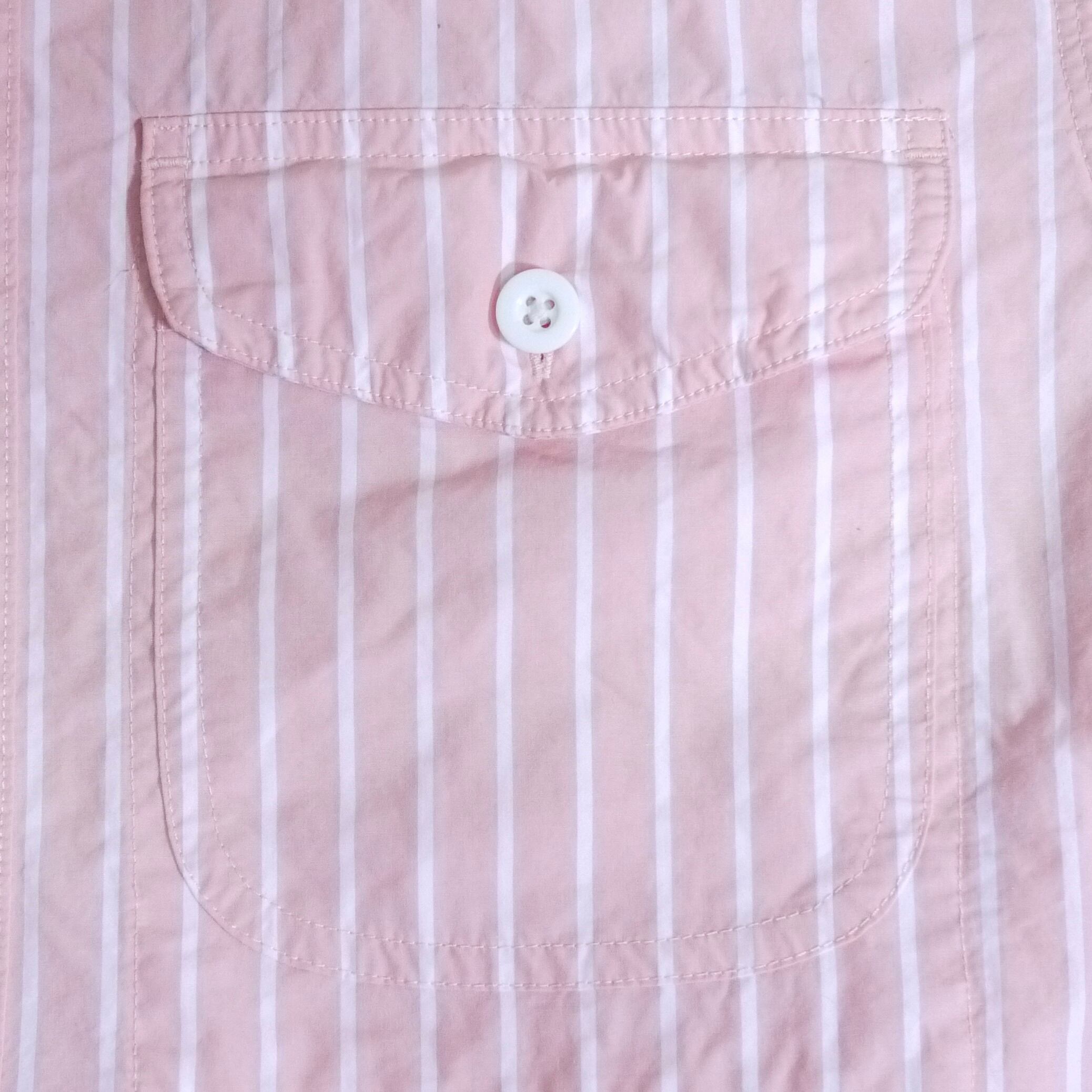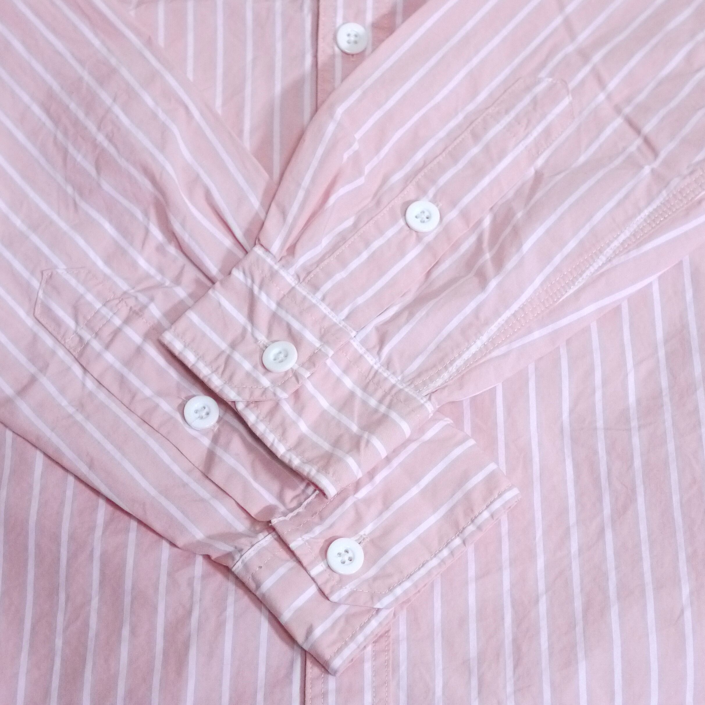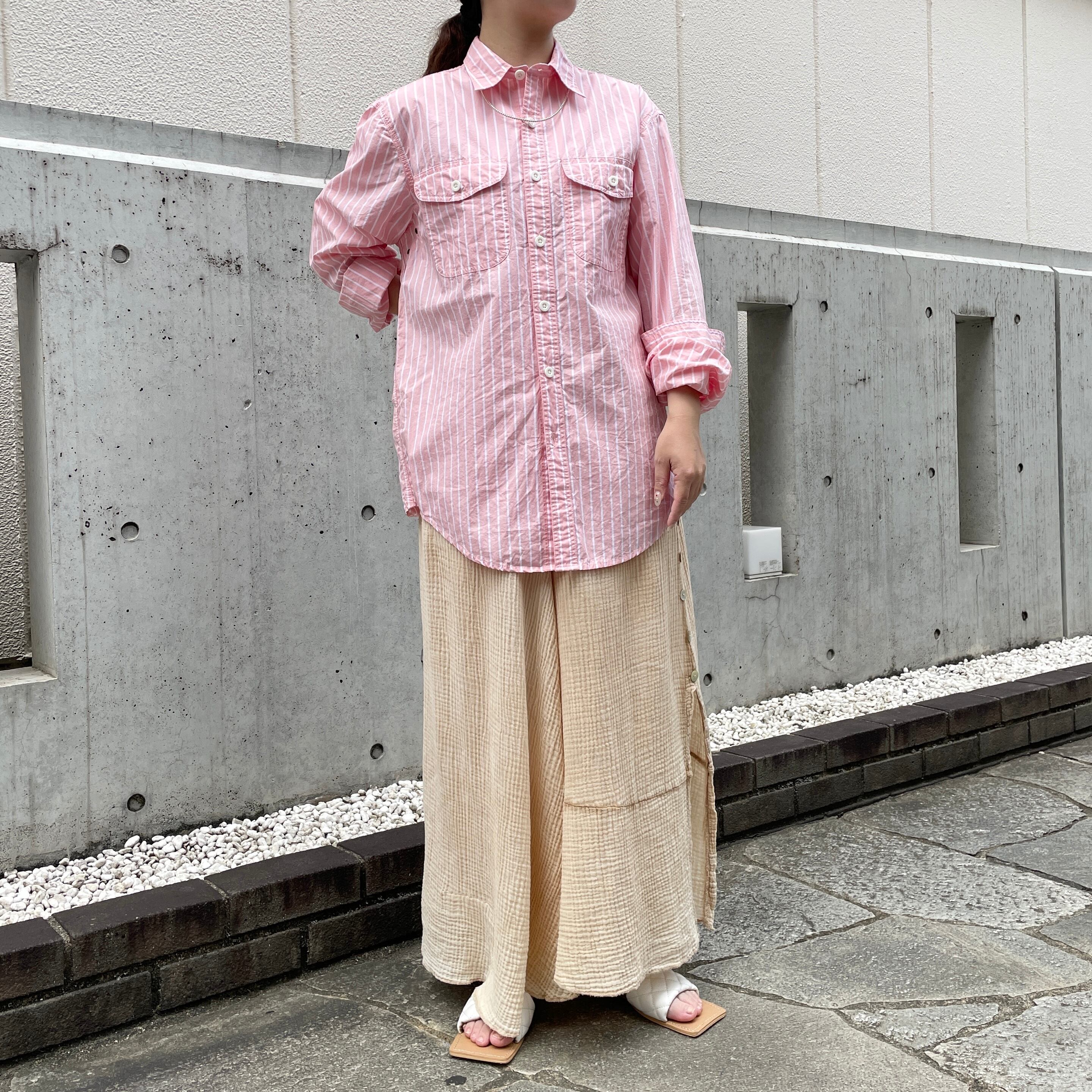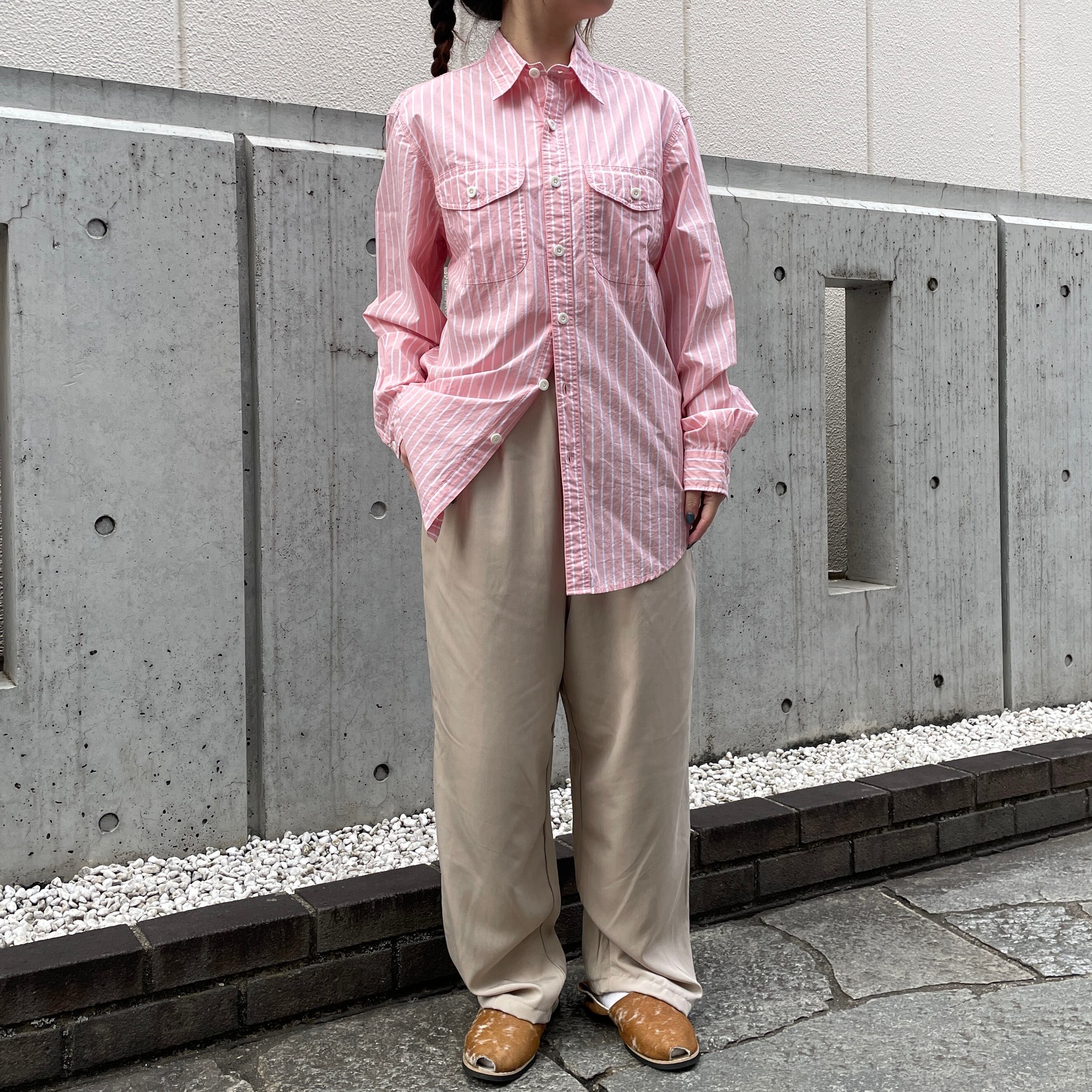 ピンク×ホワイトのストライプ柄シャツ。