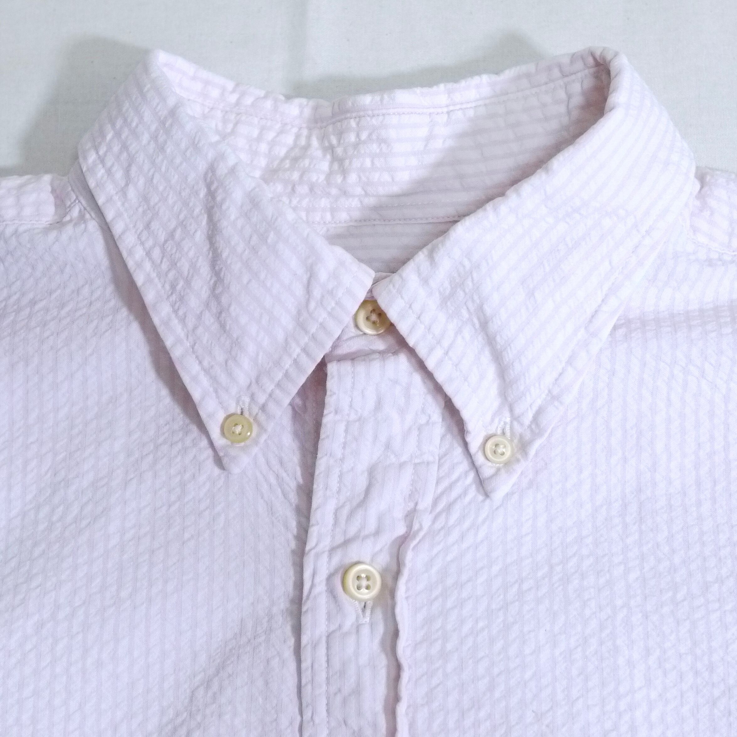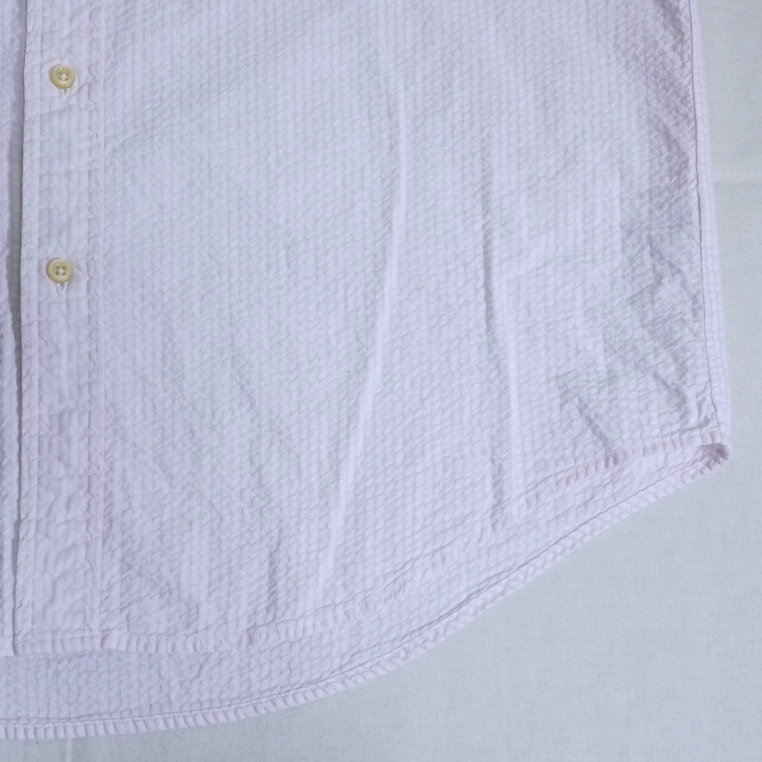 ピンク×ホワイトのストライプ柄シャツ。