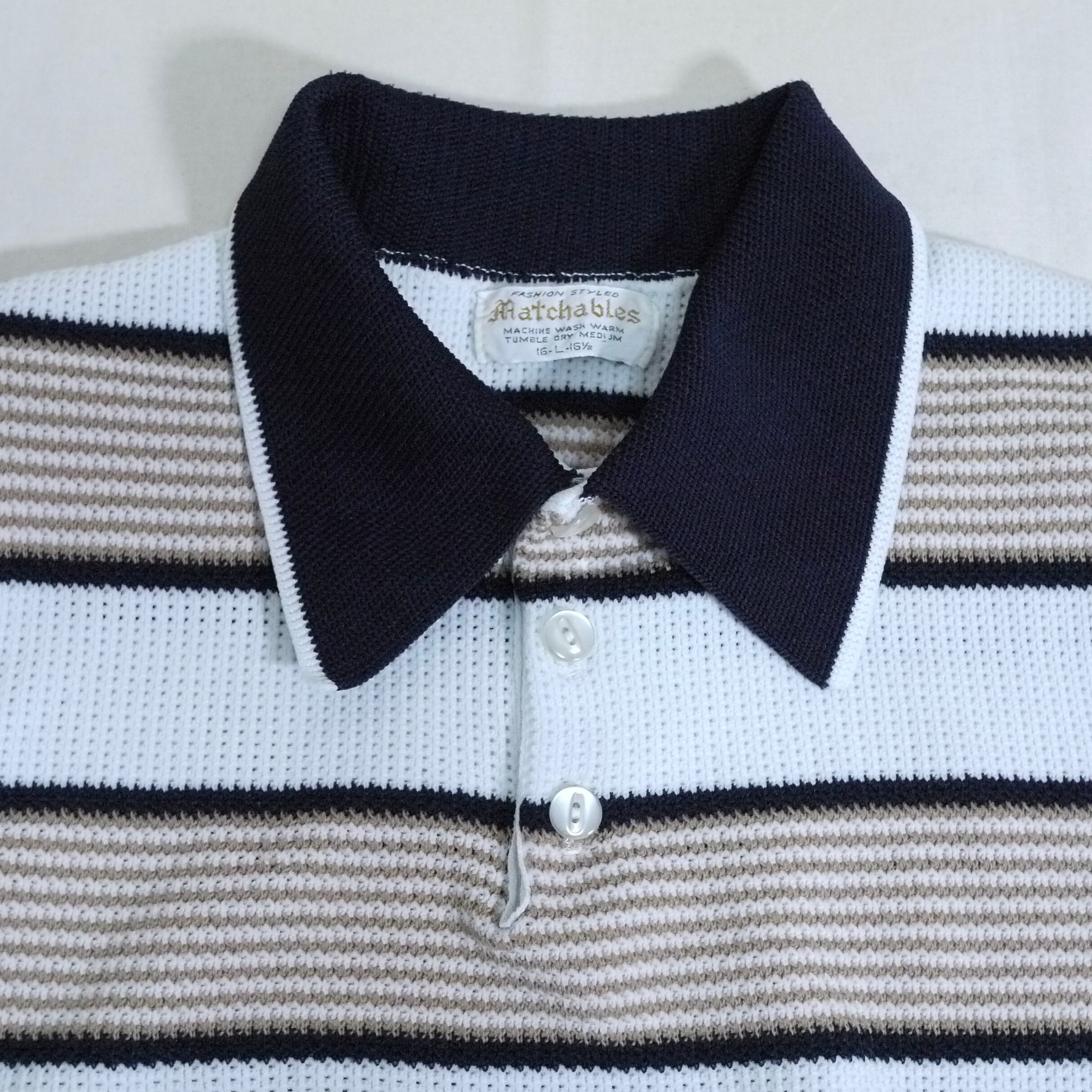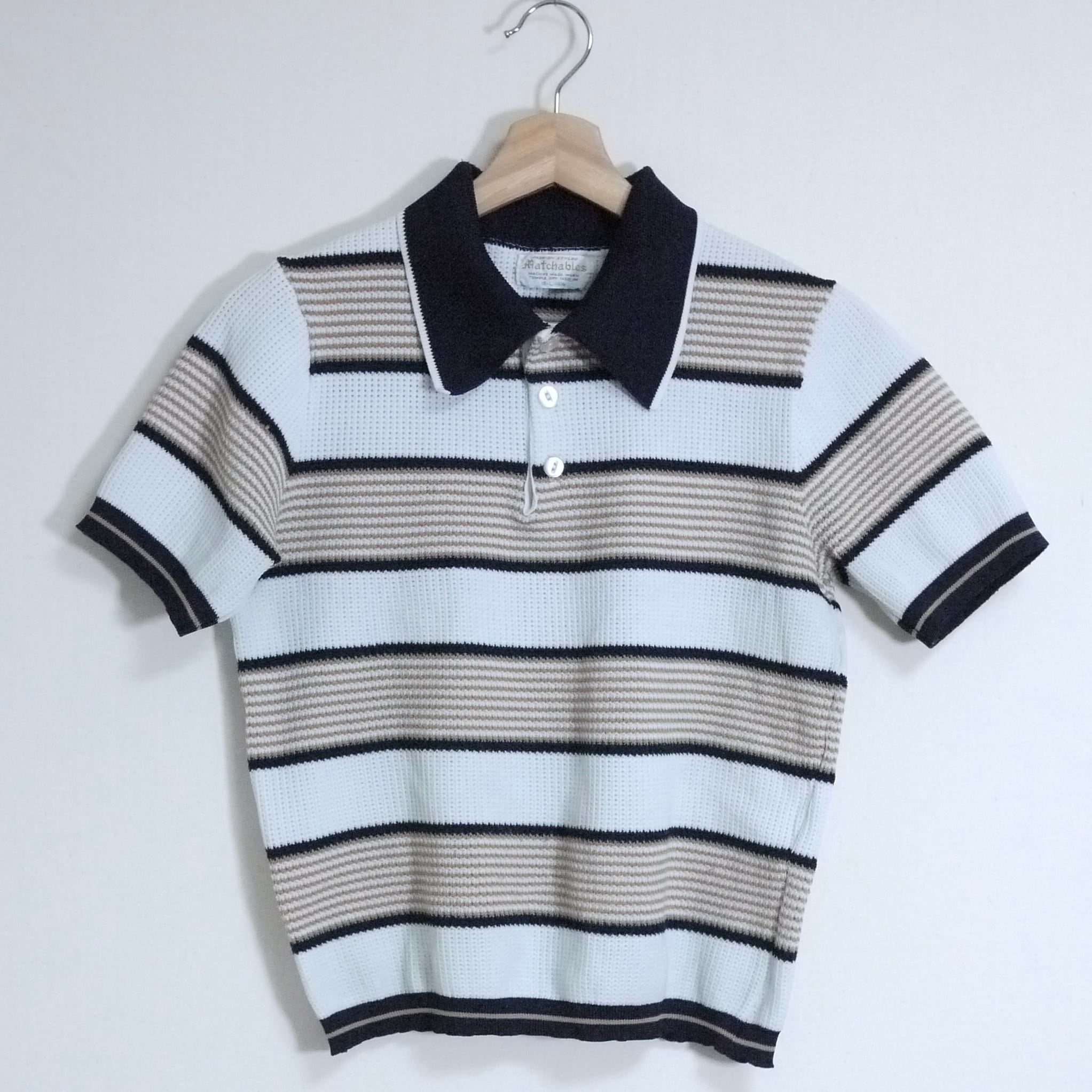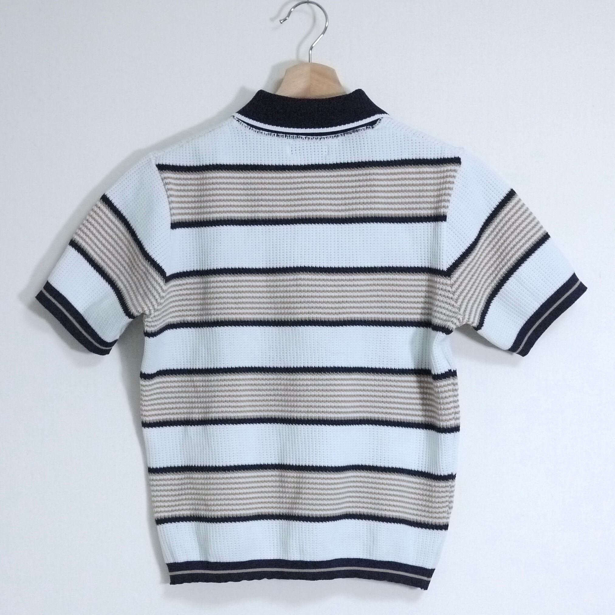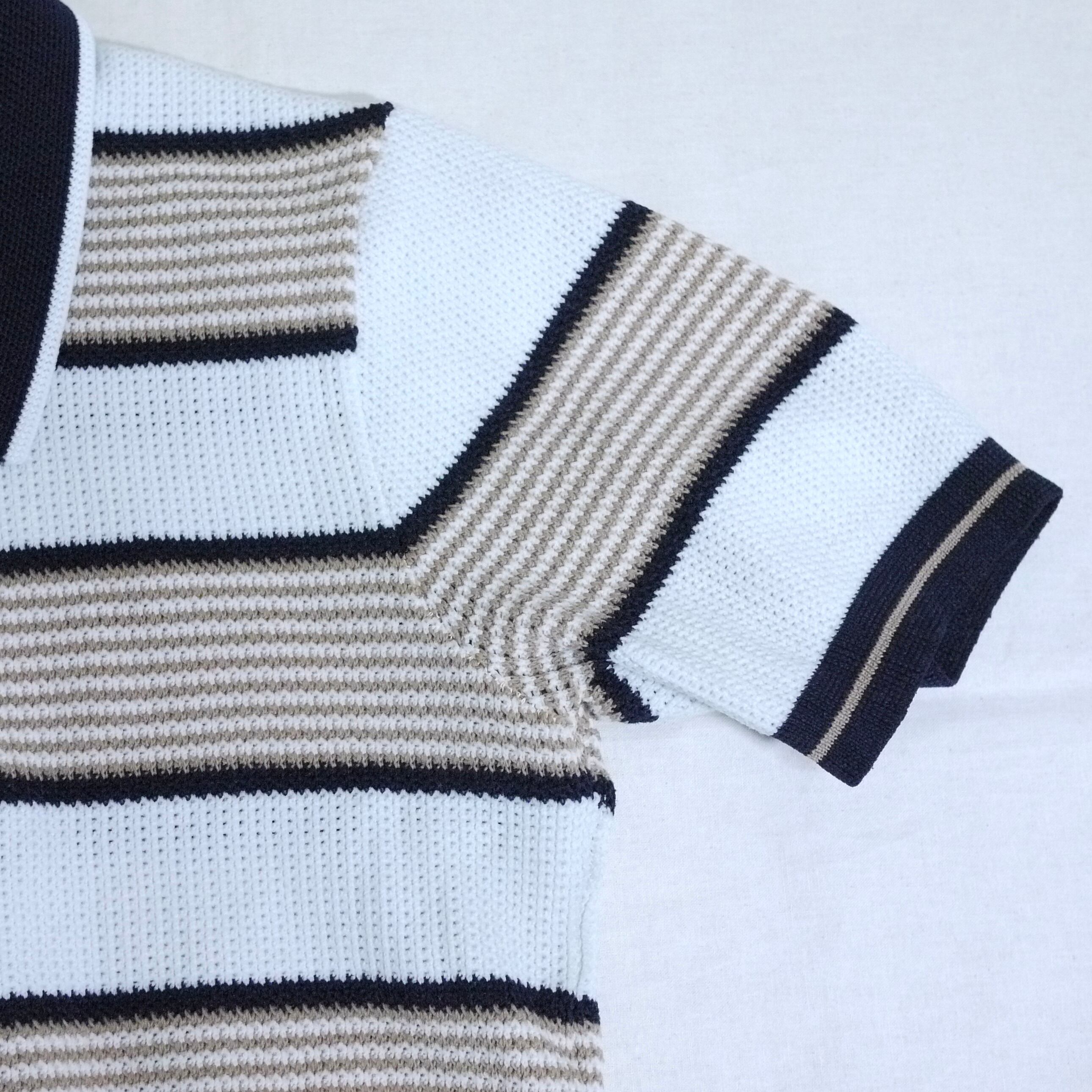 ホワイト、ベージュ、ネイビーのボーダー柄半袖ニットトップス。