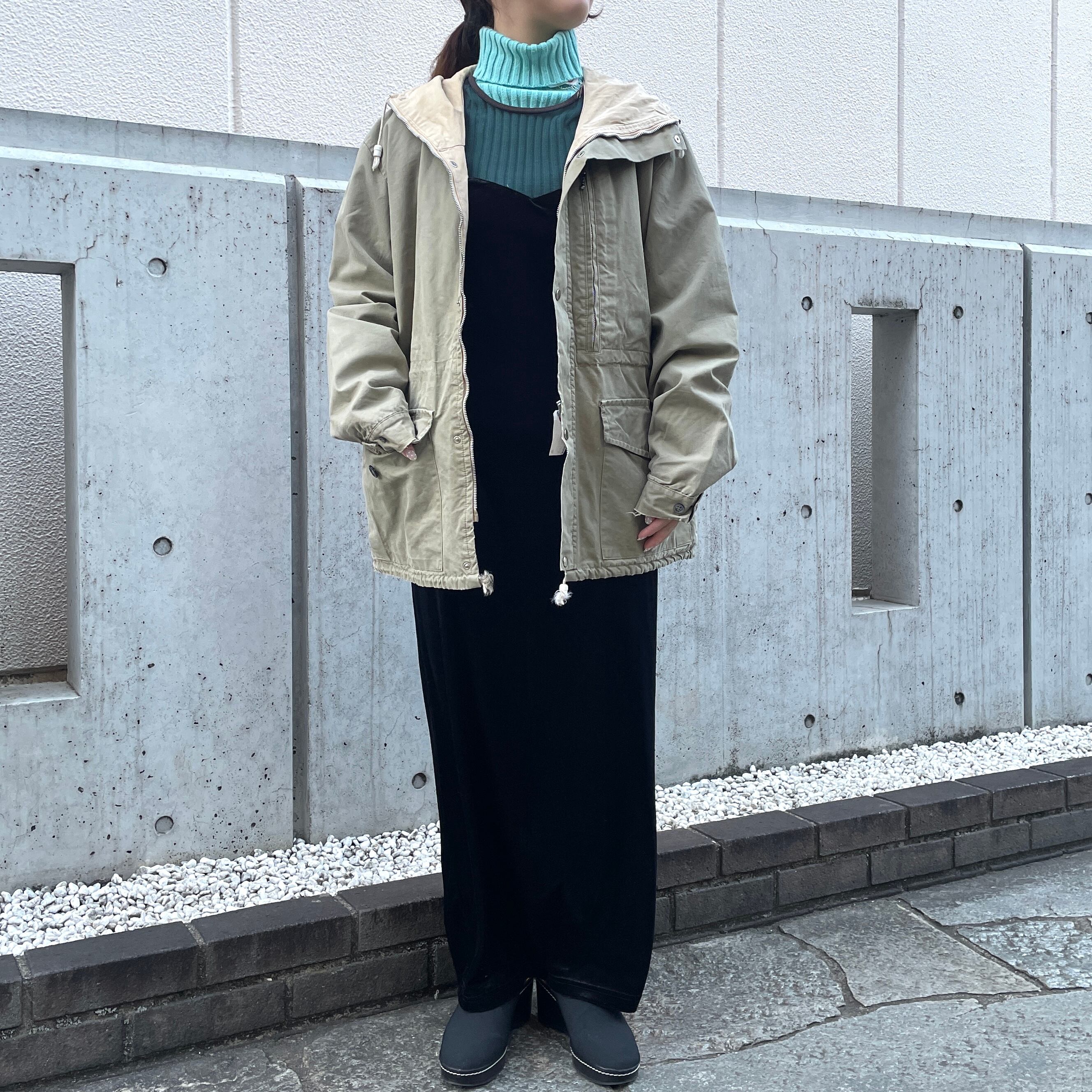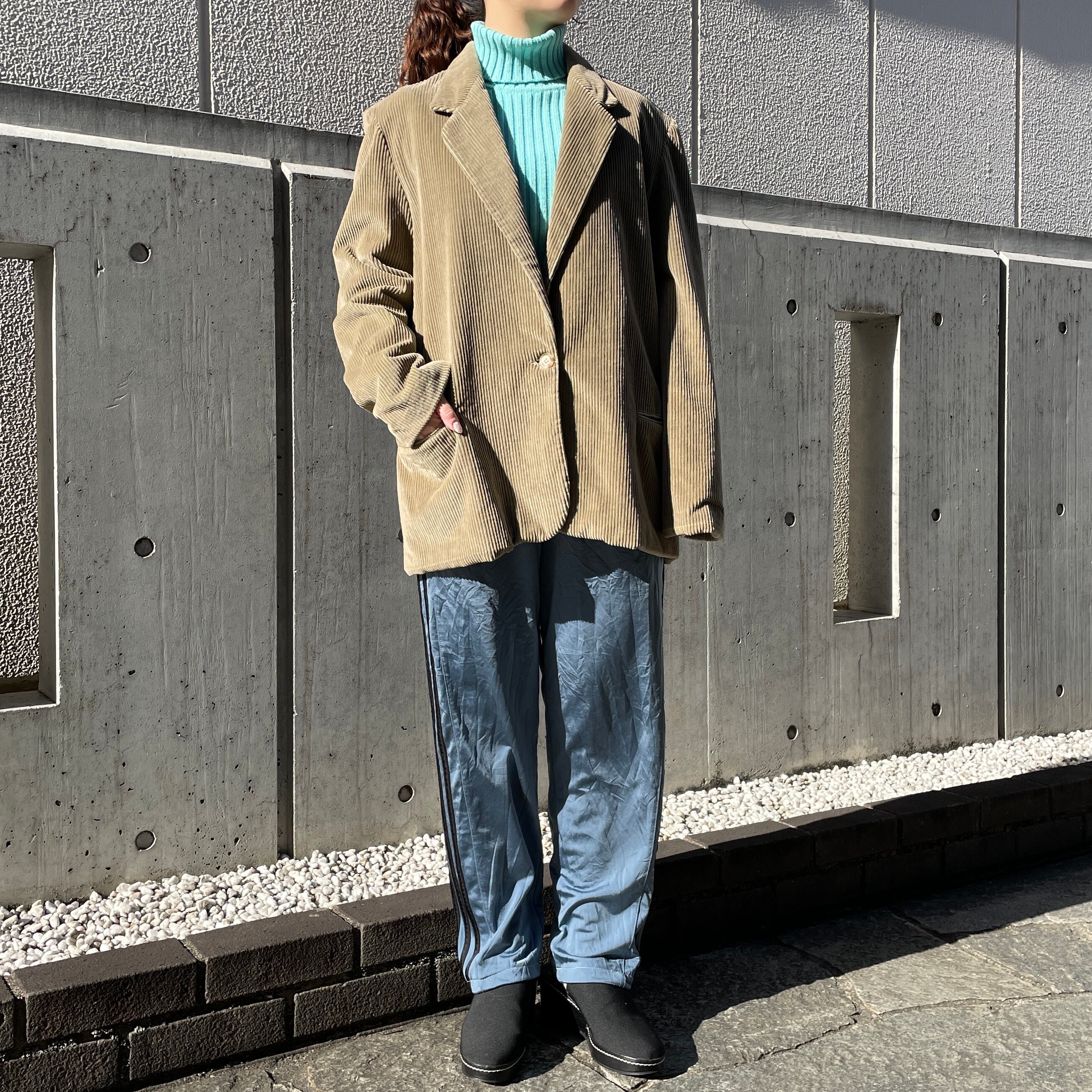タートルネックリブニット。
