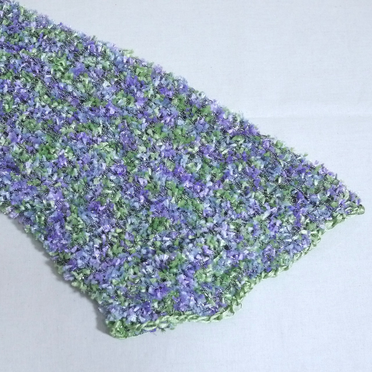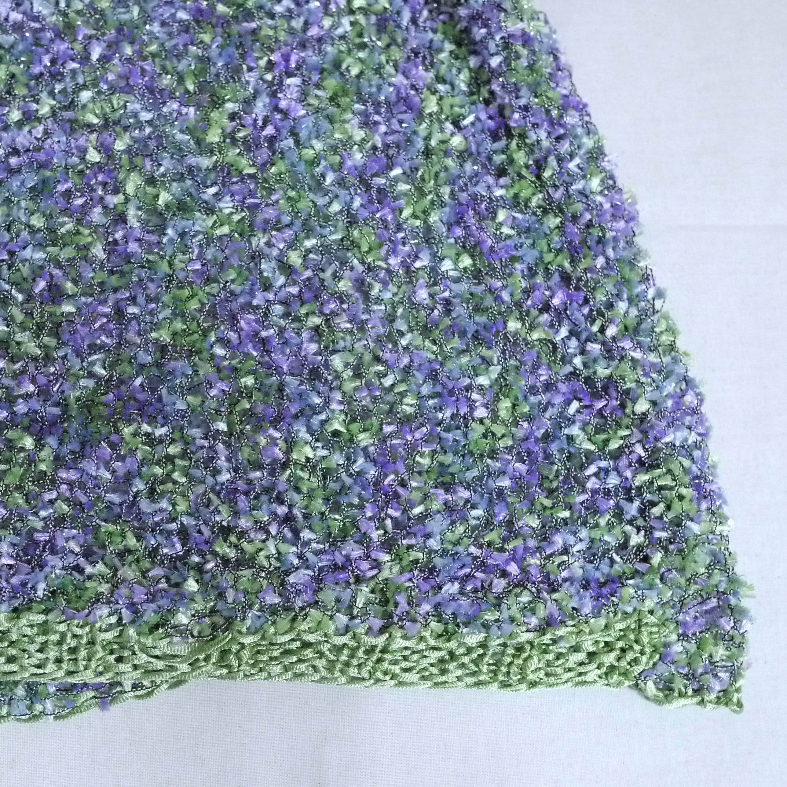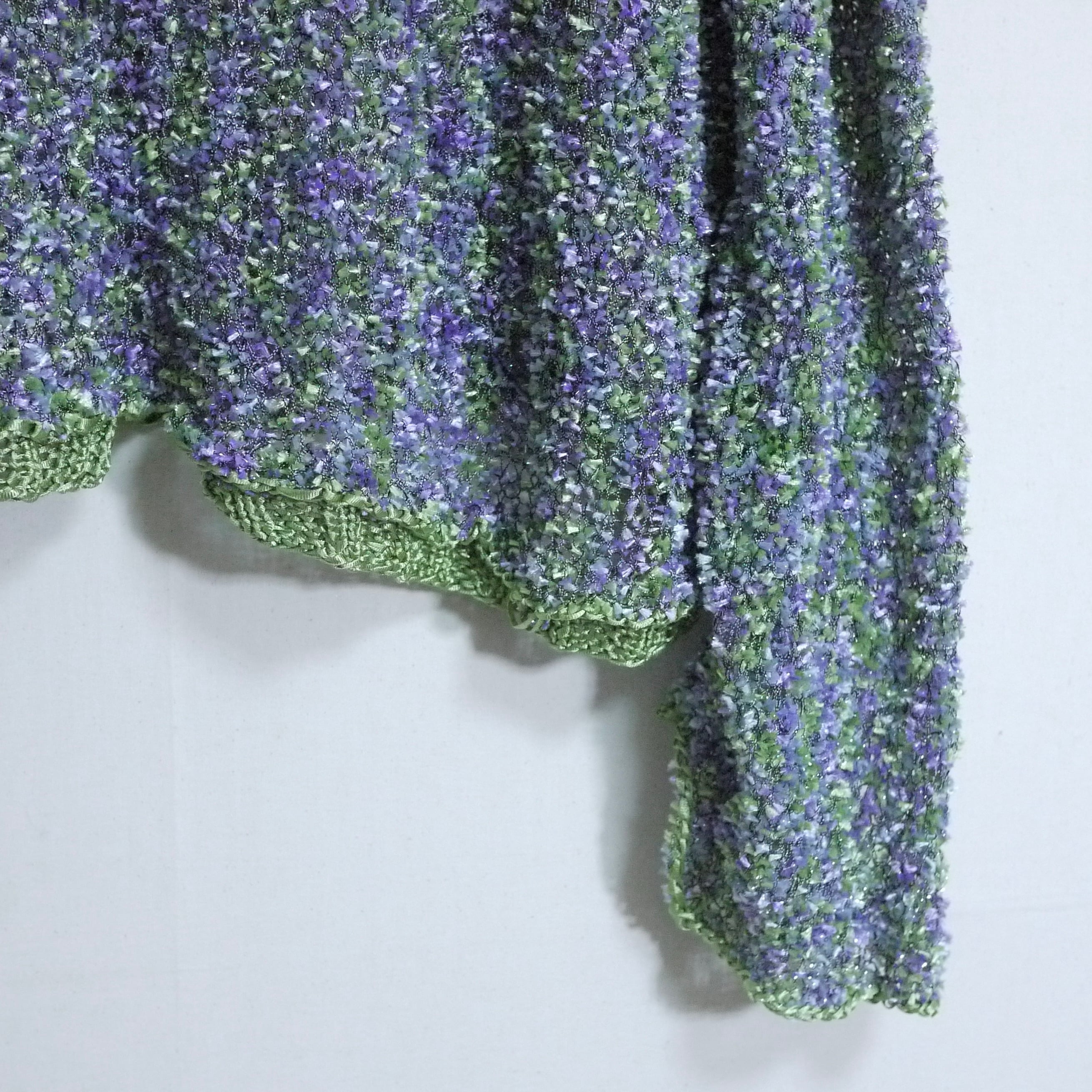 ハリ感のあるグリーンとパープルの素材とラメが編まれていて総柄のようなデザイン。