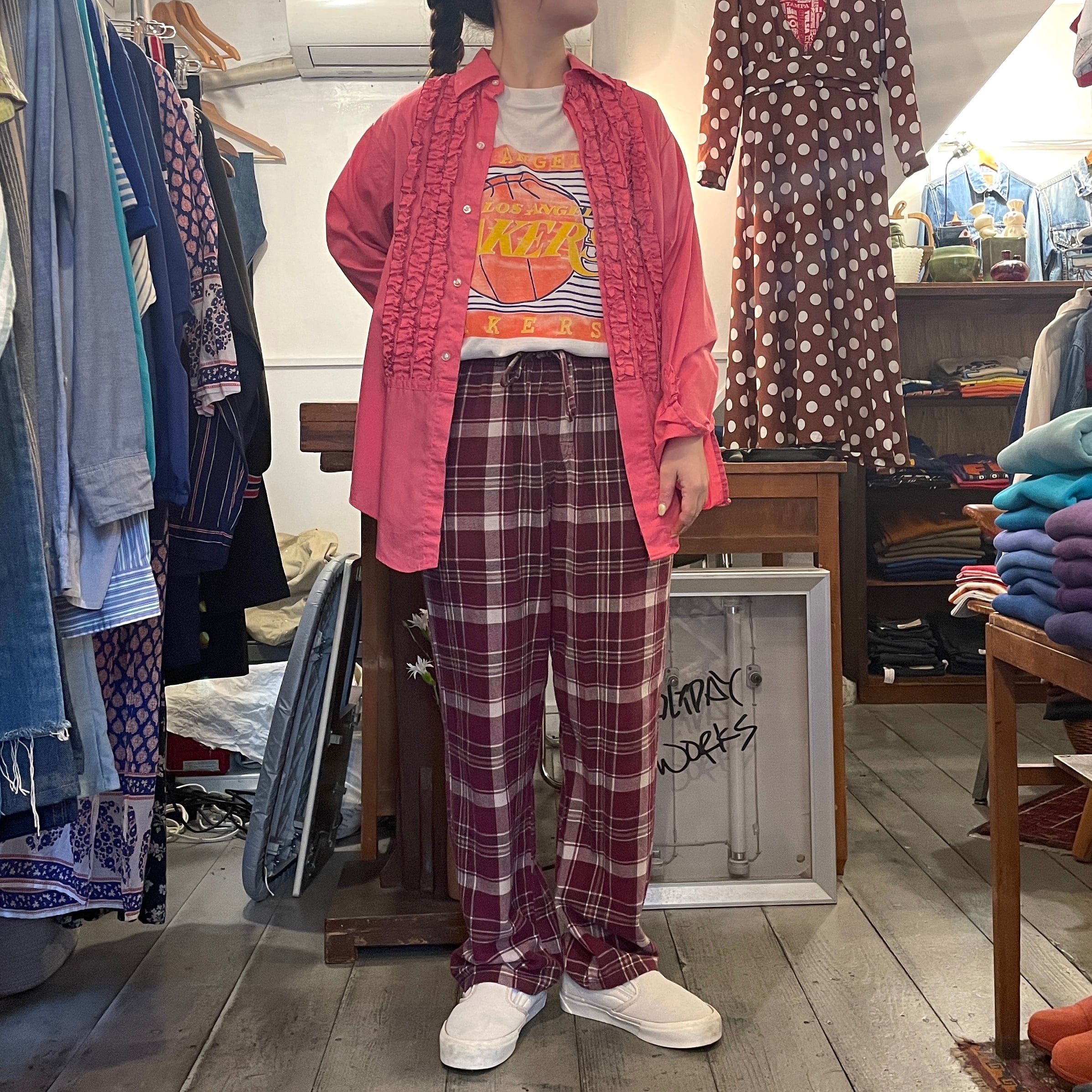 ウエストを紐とゴムで調節できるイージーパンツ仕様でポケット付き。