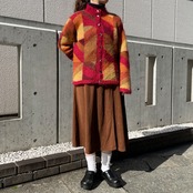 レッド、ブラウンなどの総柄ニットカーディガン。