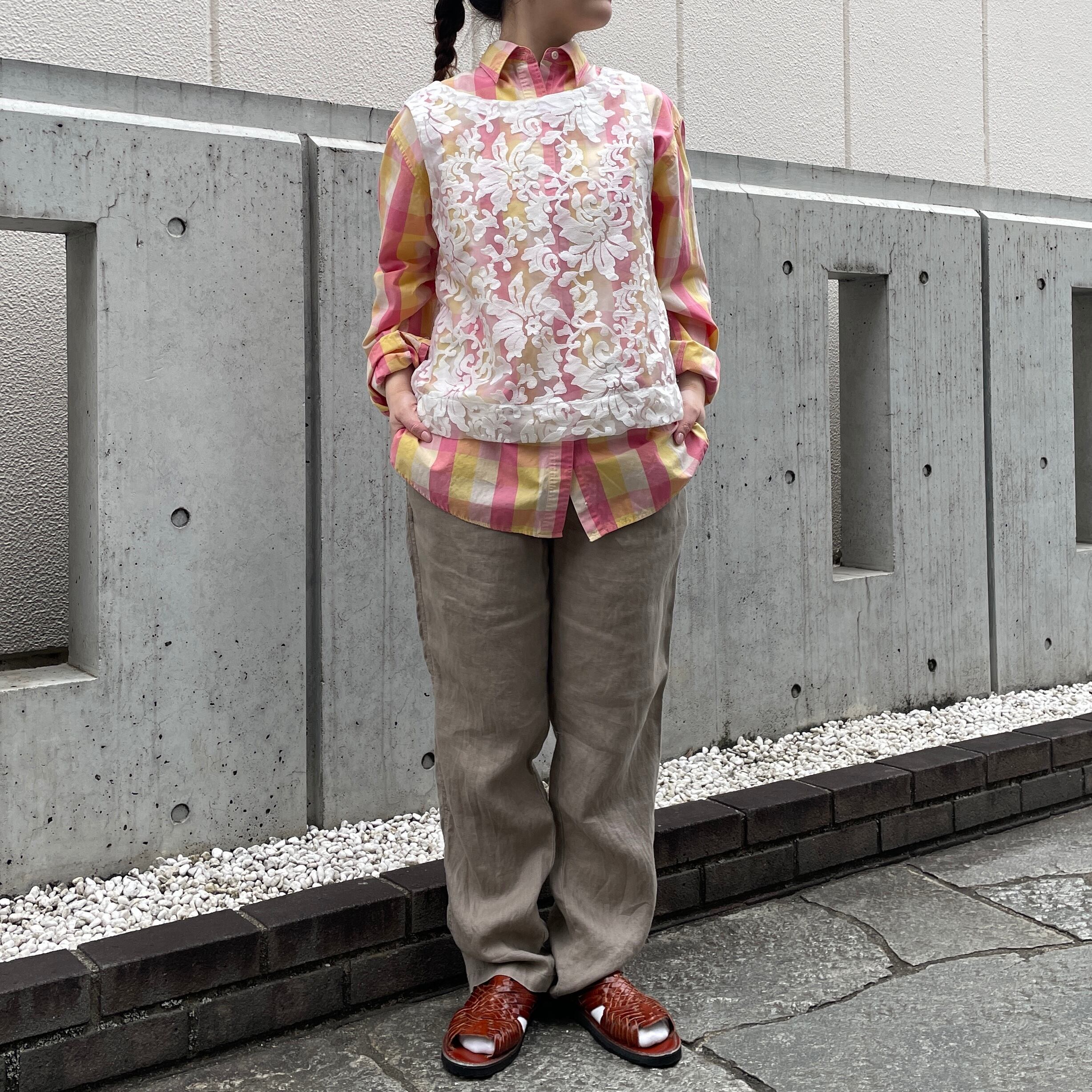 ピンク、イエロー、ホワイトのチェック柄シャツ。