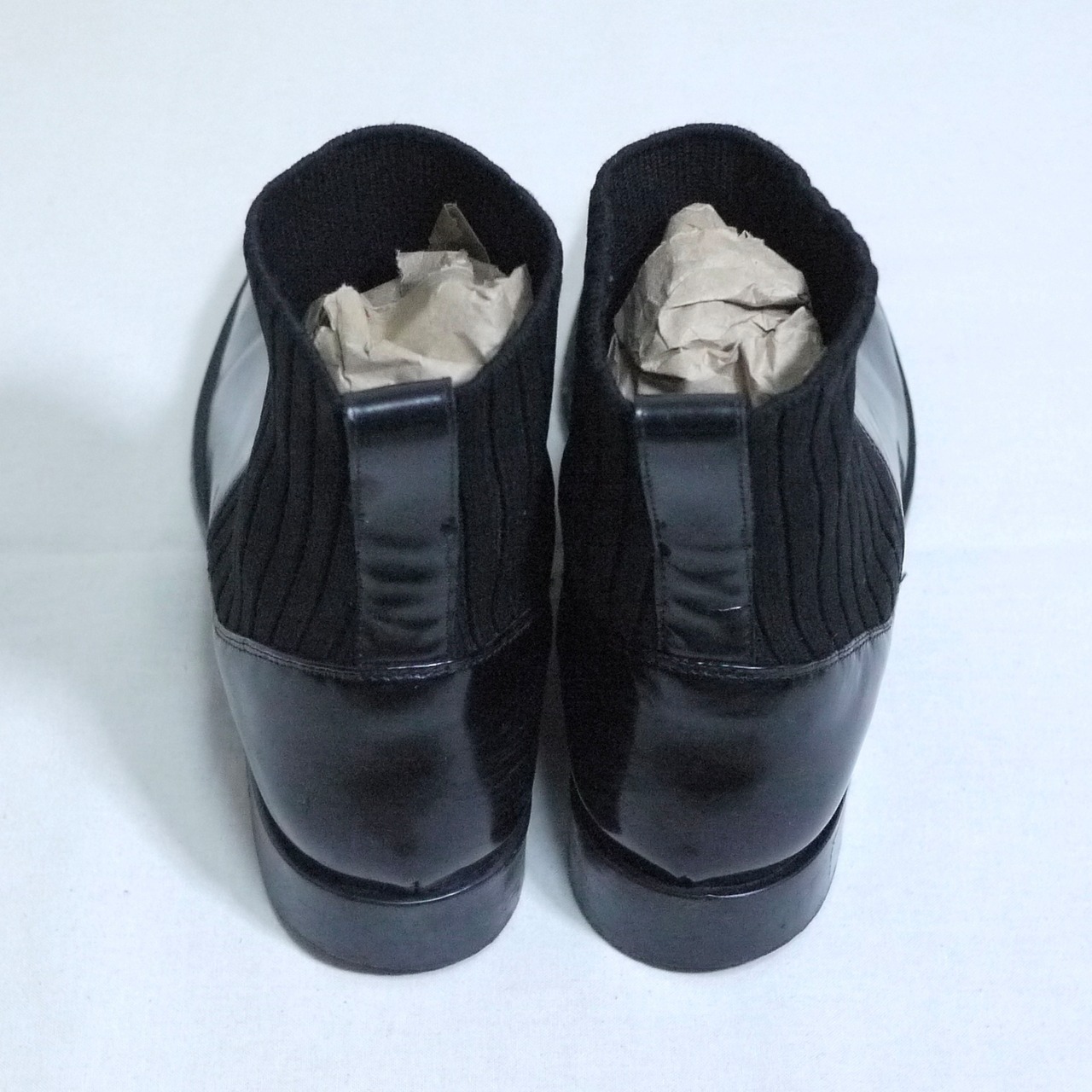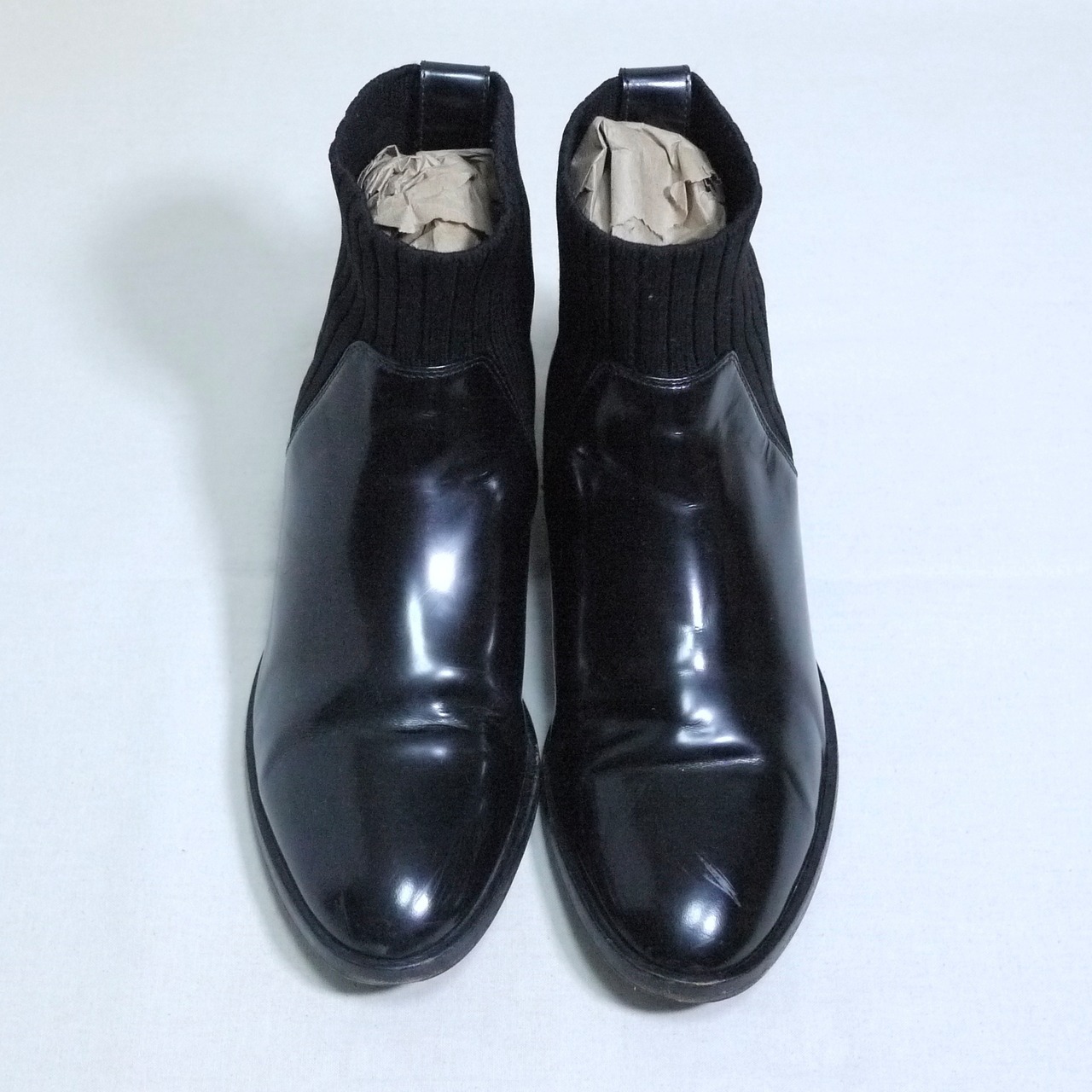 光沢感のあるビニールのような素材感のアッパーとリブ素材の履き口の切り替えデザイン。