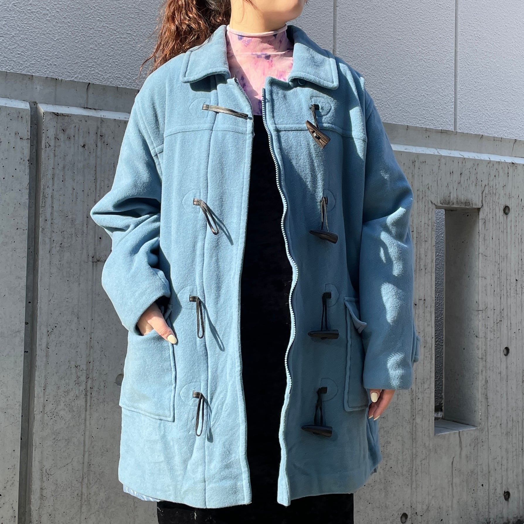 ブルーカラーのダッフルコート。
