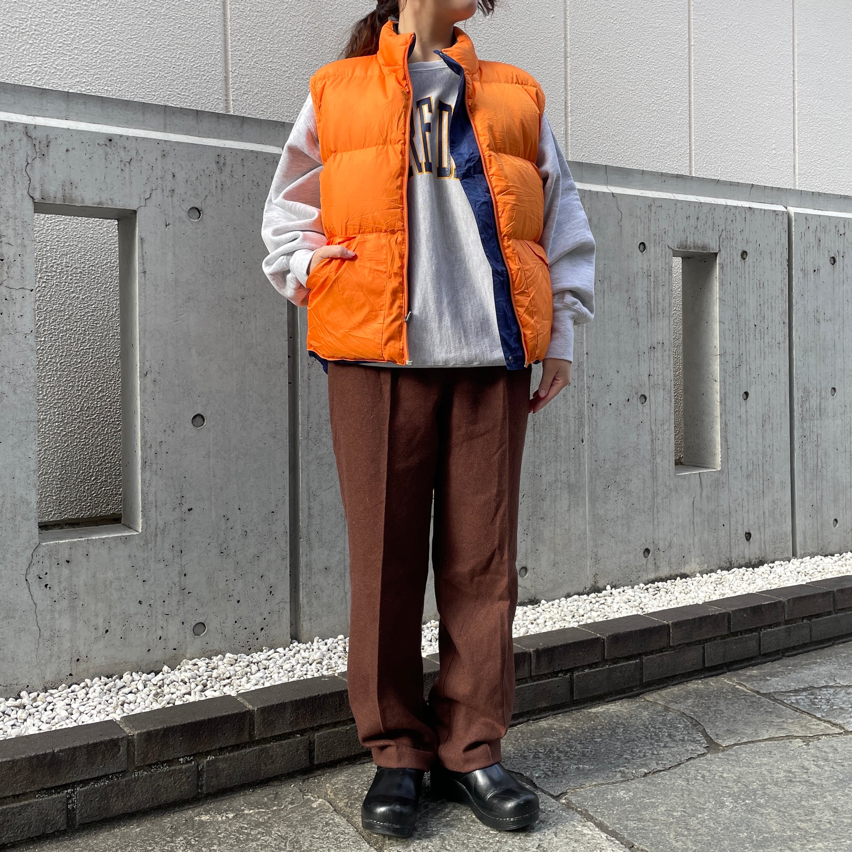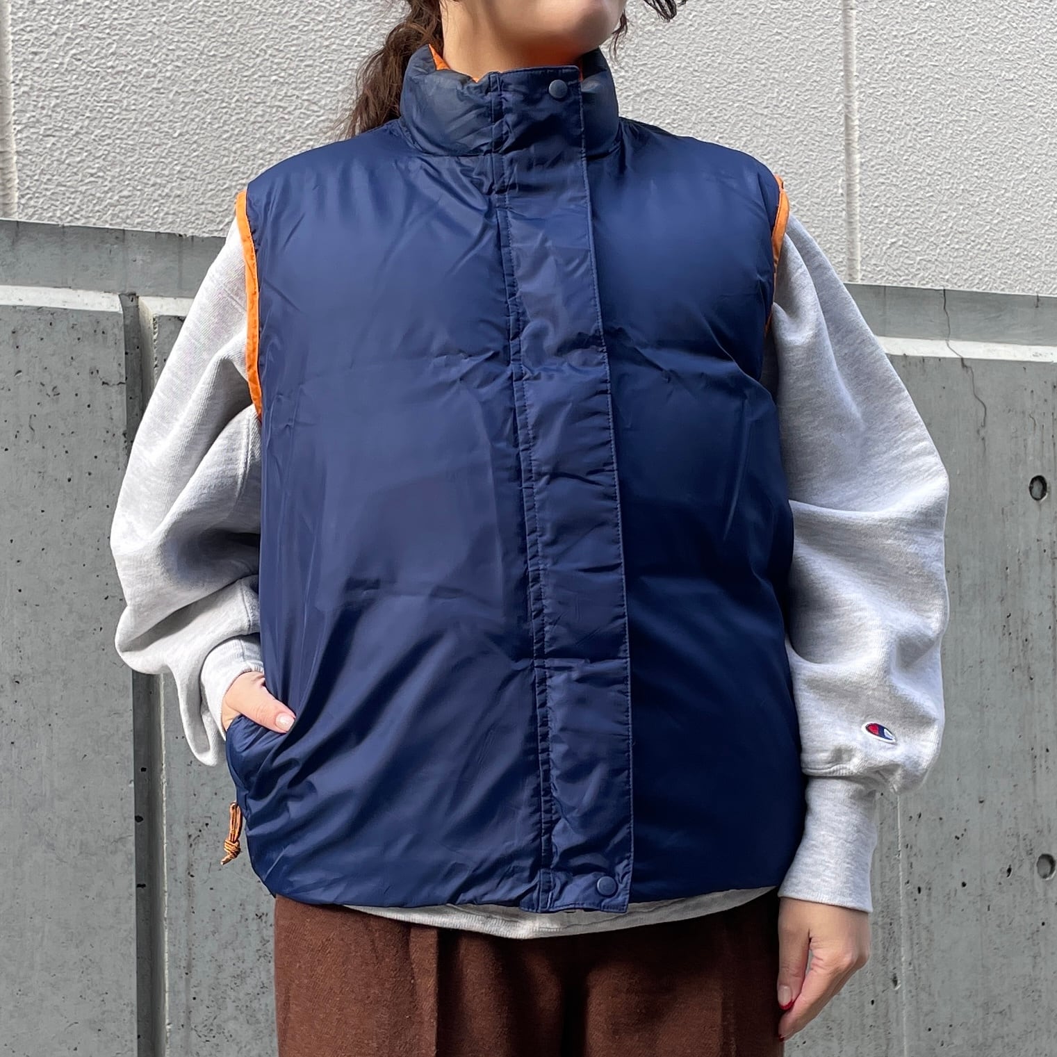 オレンジ×ネイビーのリバーシブルダウンベスト。