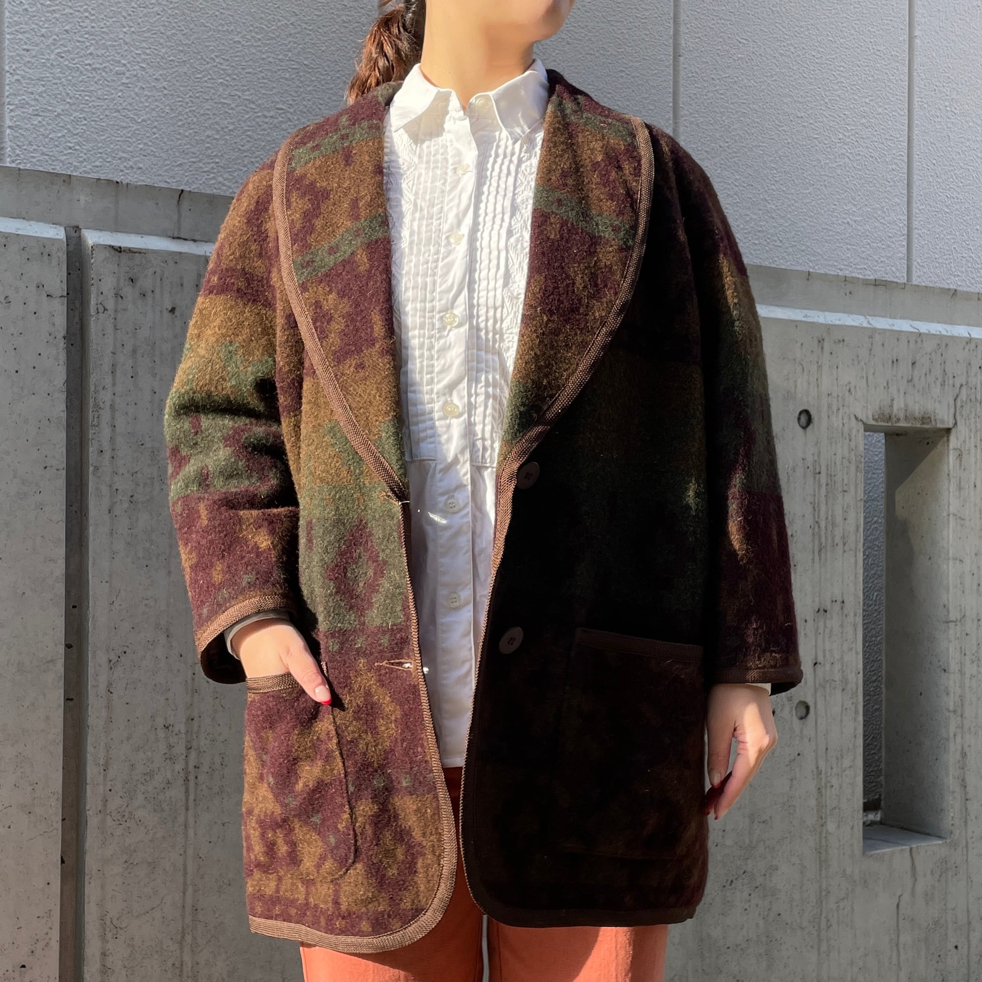 ブラウン系カラーがベースの総柄ウールコート。