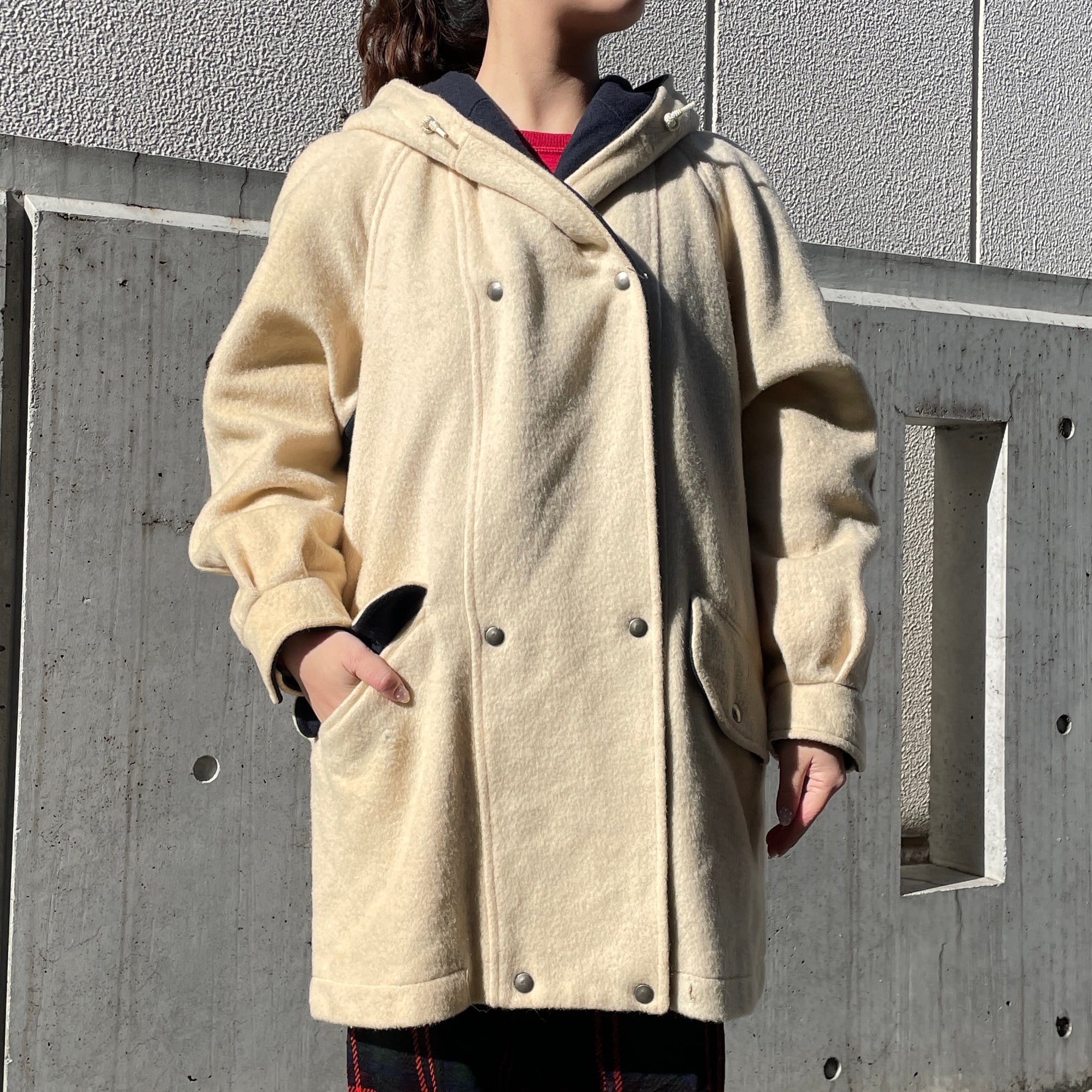 Pコートのようなデザインですが、フード付きでスナップボタンのためカジュアルな印象。