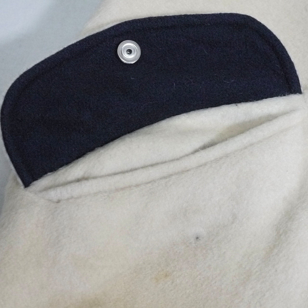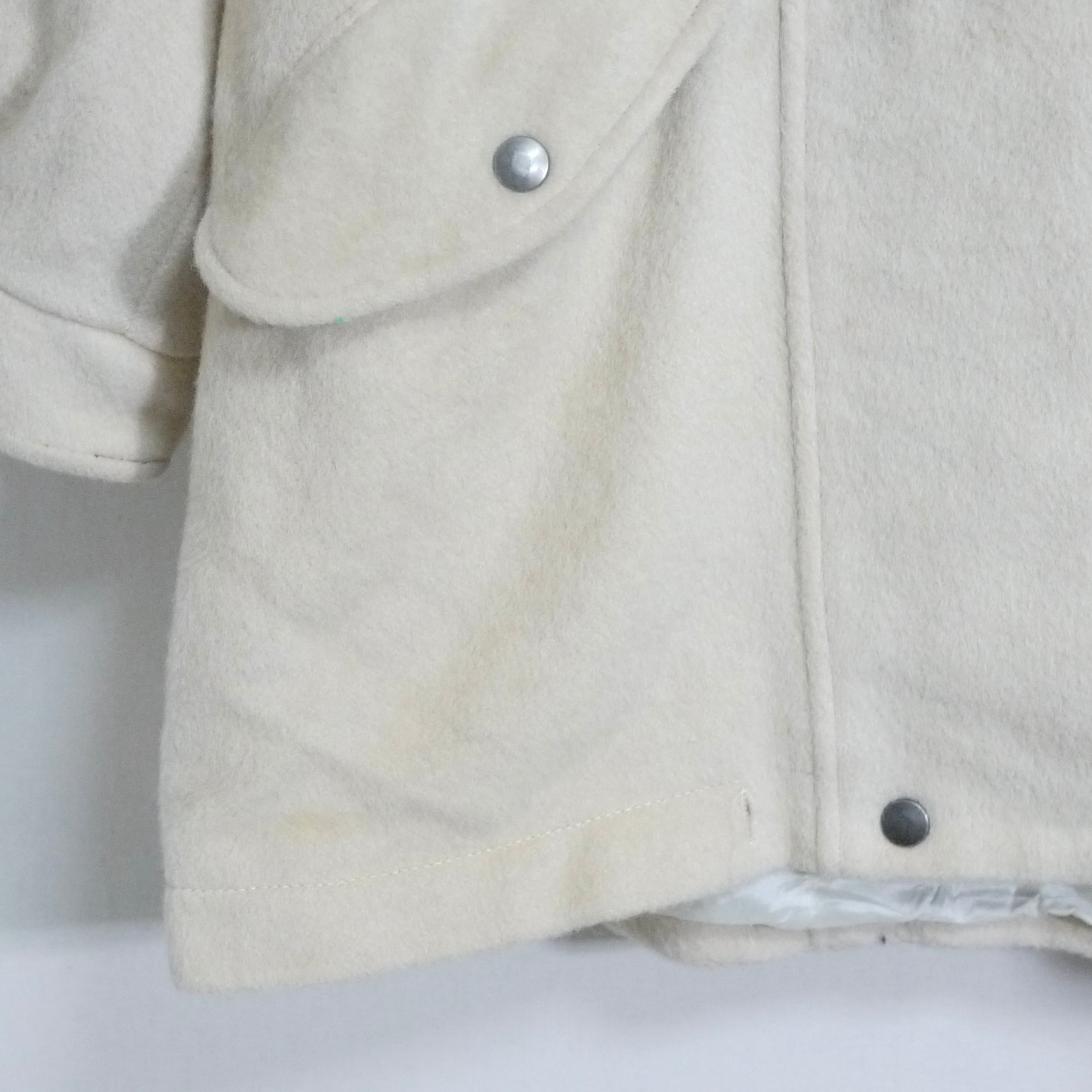 状態は、右ポケット下部に薄ら汚れ。所々に生地の薄くなった箇所や細かな汚れ。左袖と右ポケットのスナップボタンが破損。その他、経年による使用感がありますが、着用に問題はありません。
