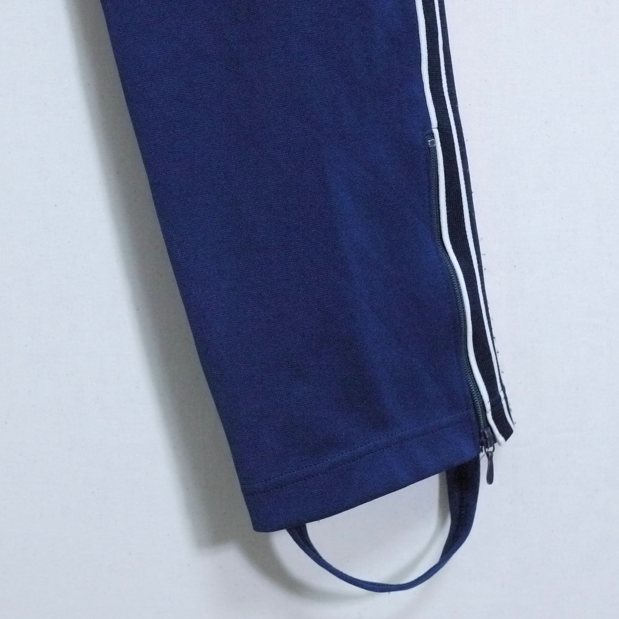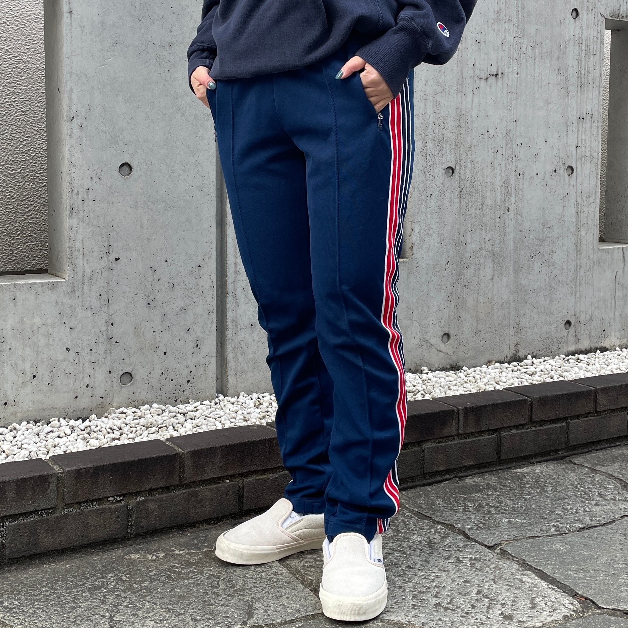 ネイビーカラーのトラックパンツ。