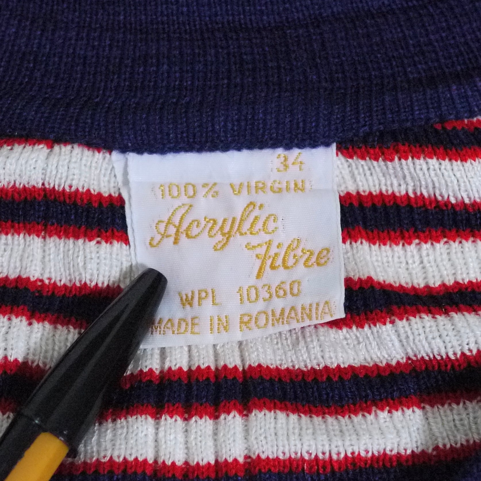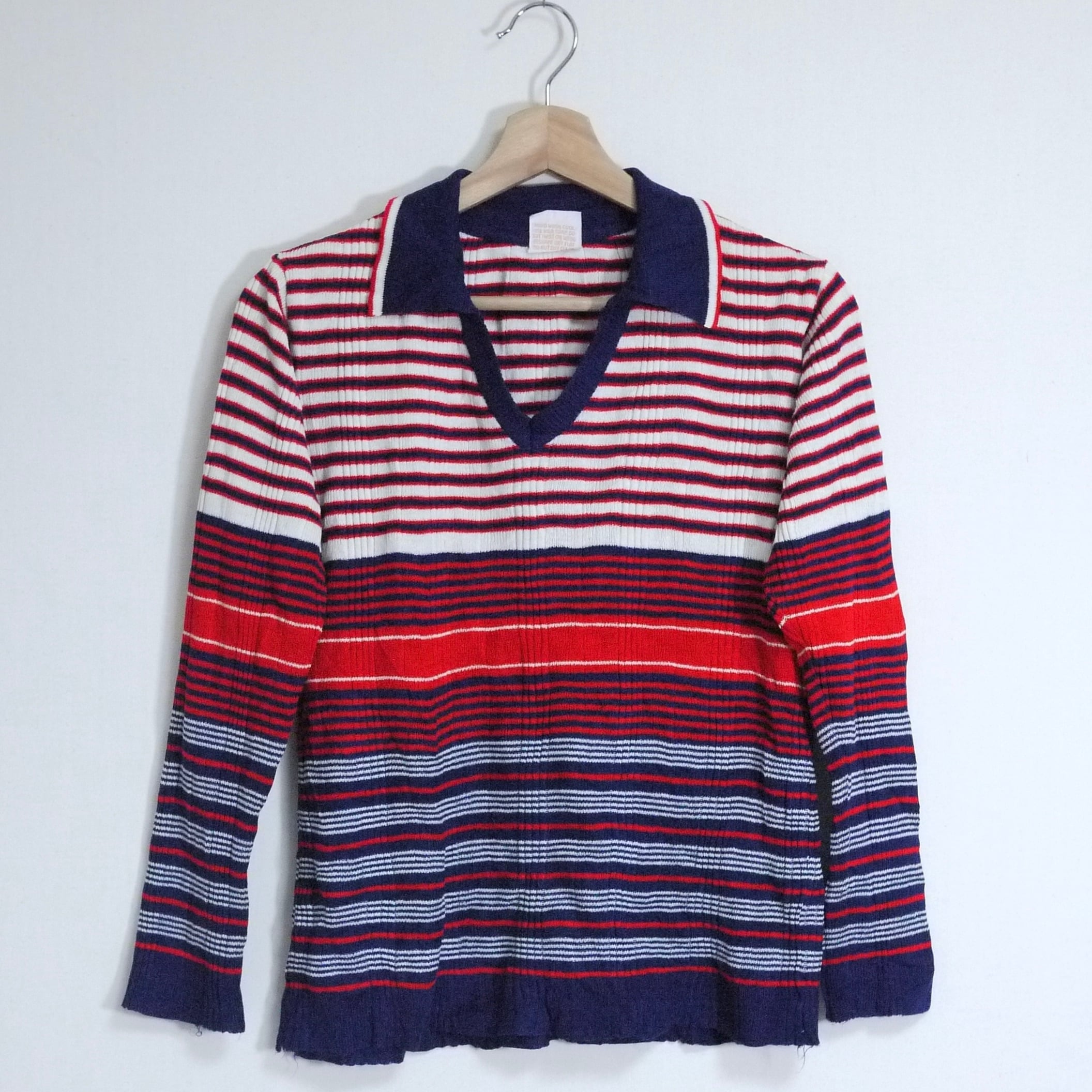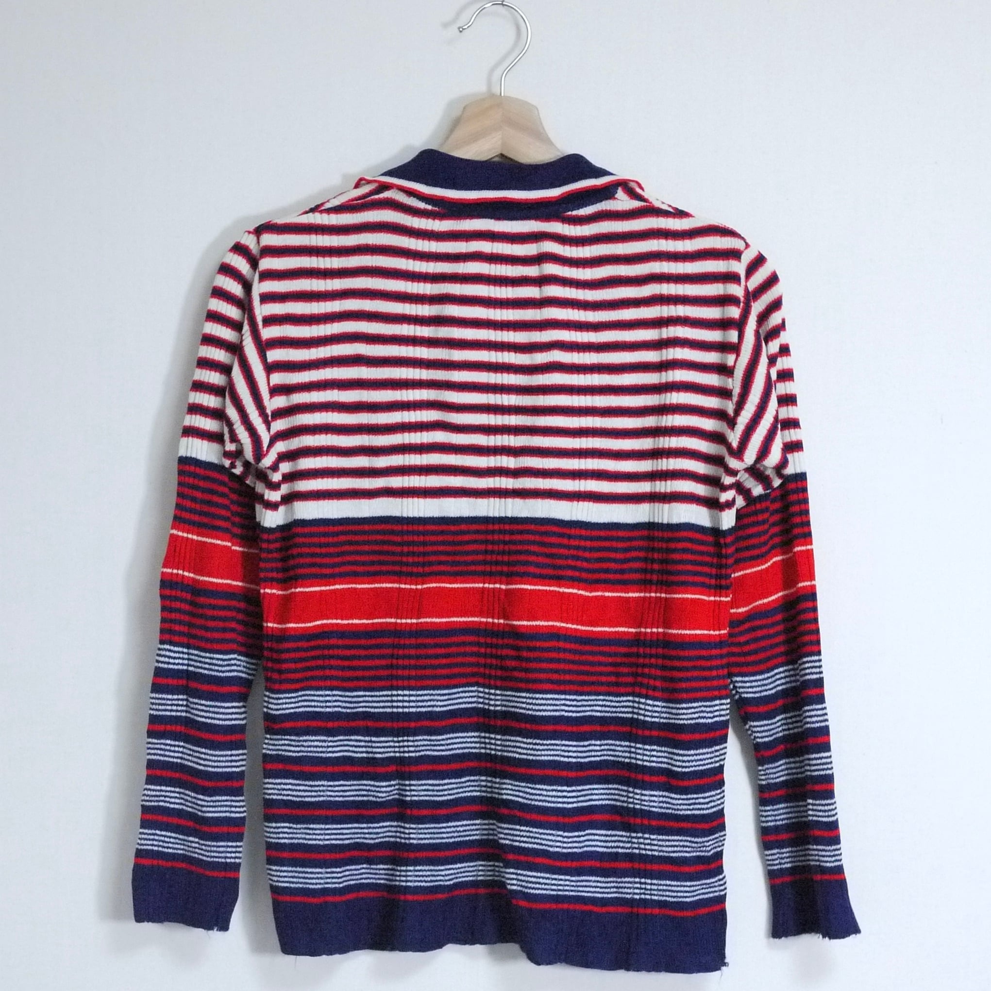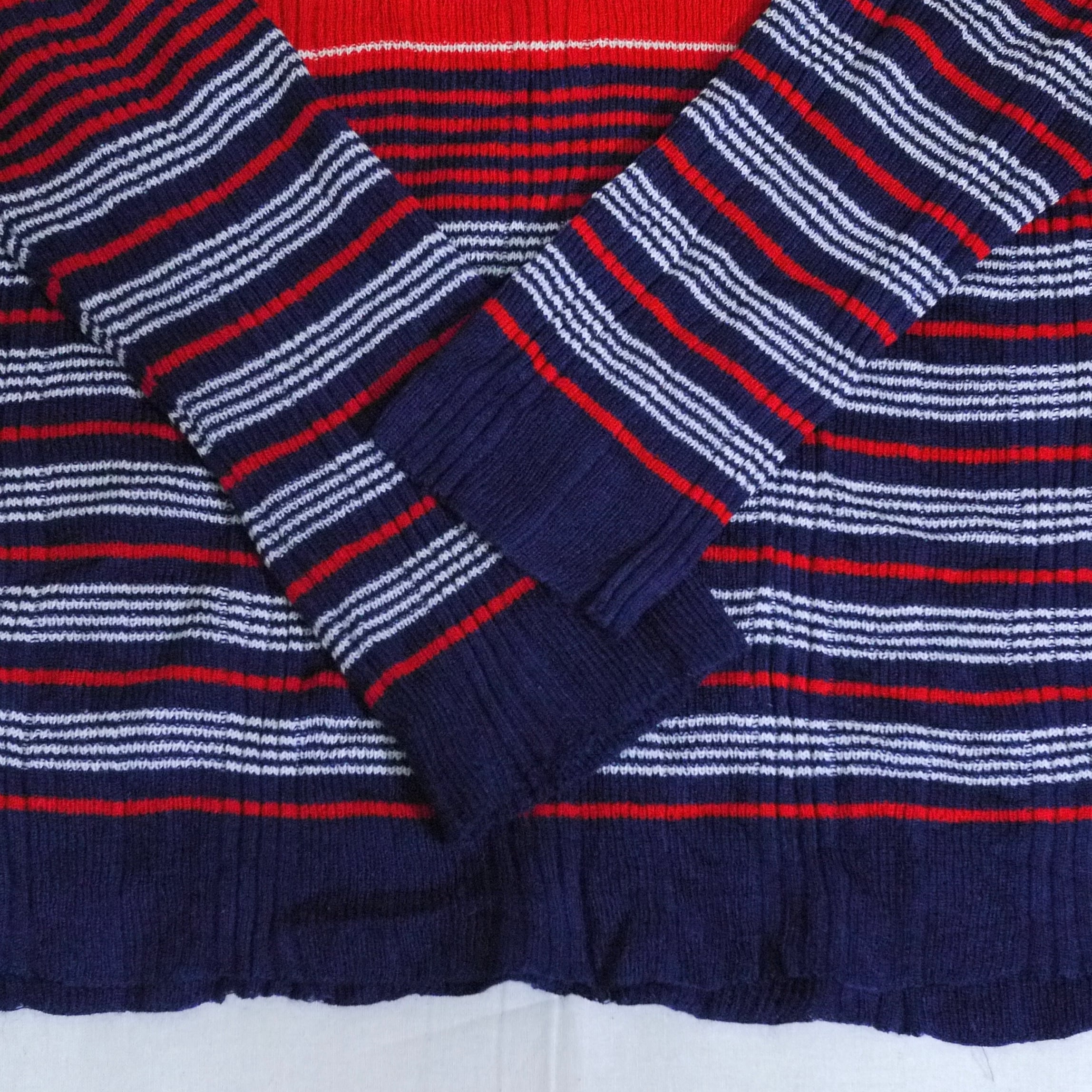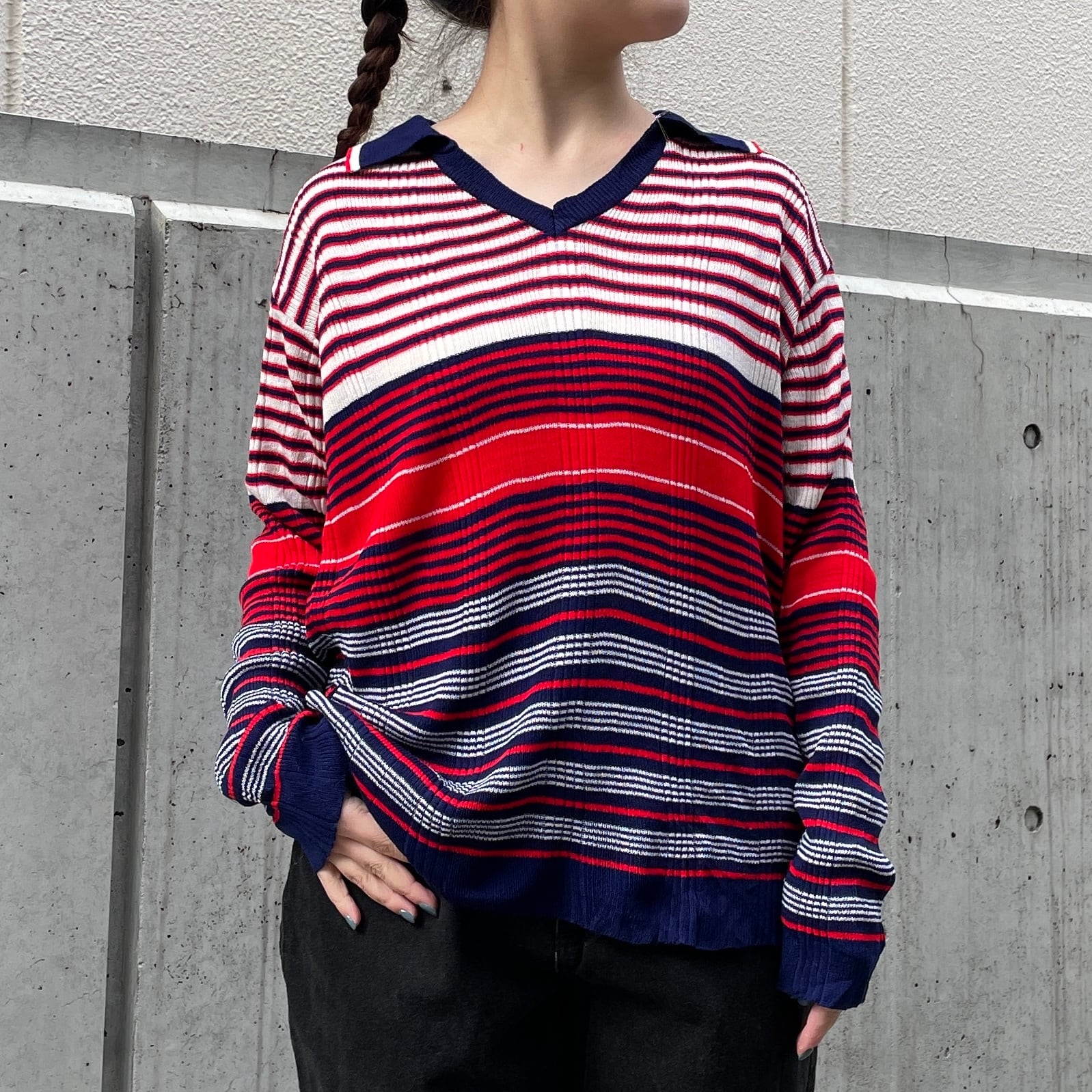 ネイビー、レッド、ホワイトのボーダー柄トップス。