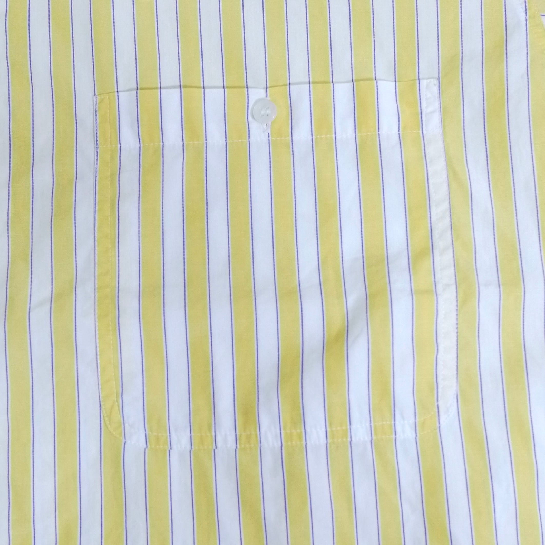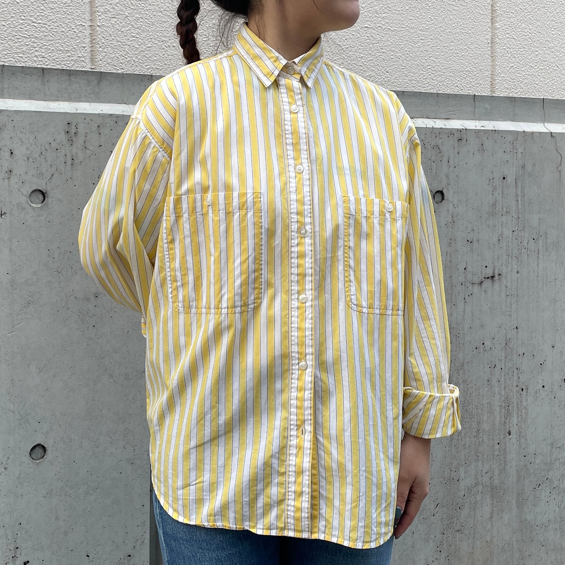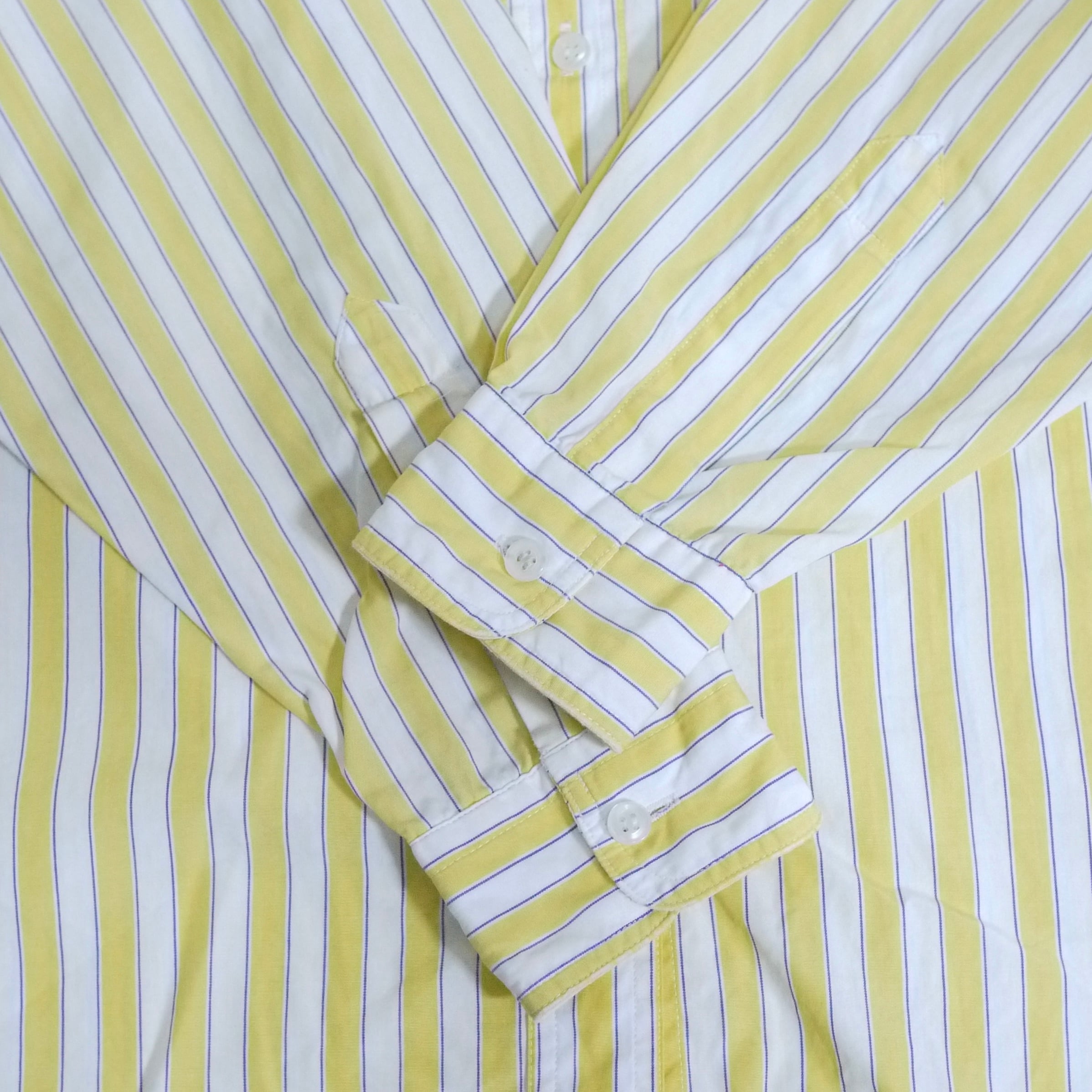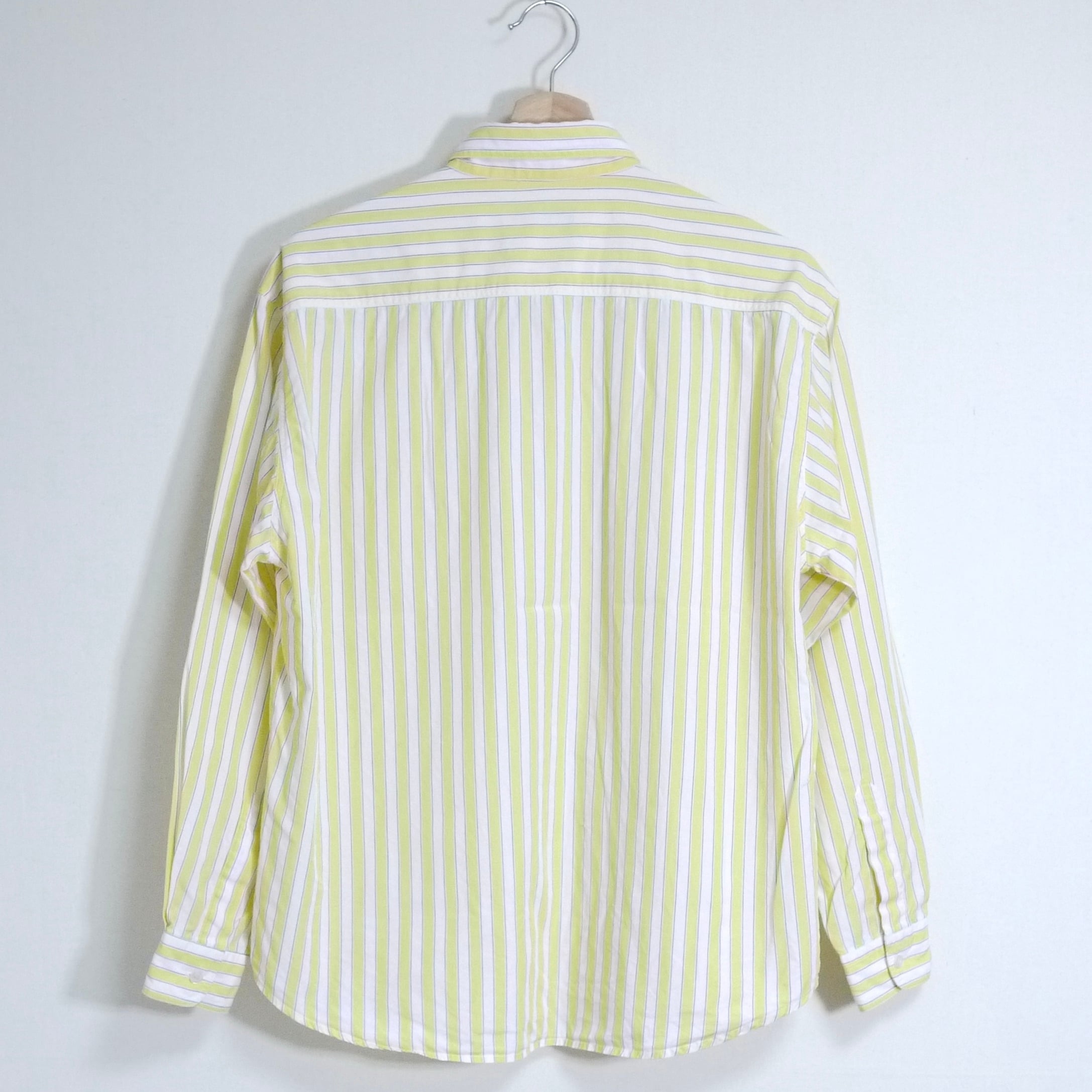 ホワイト×イエローのストライプ柄シャツ。