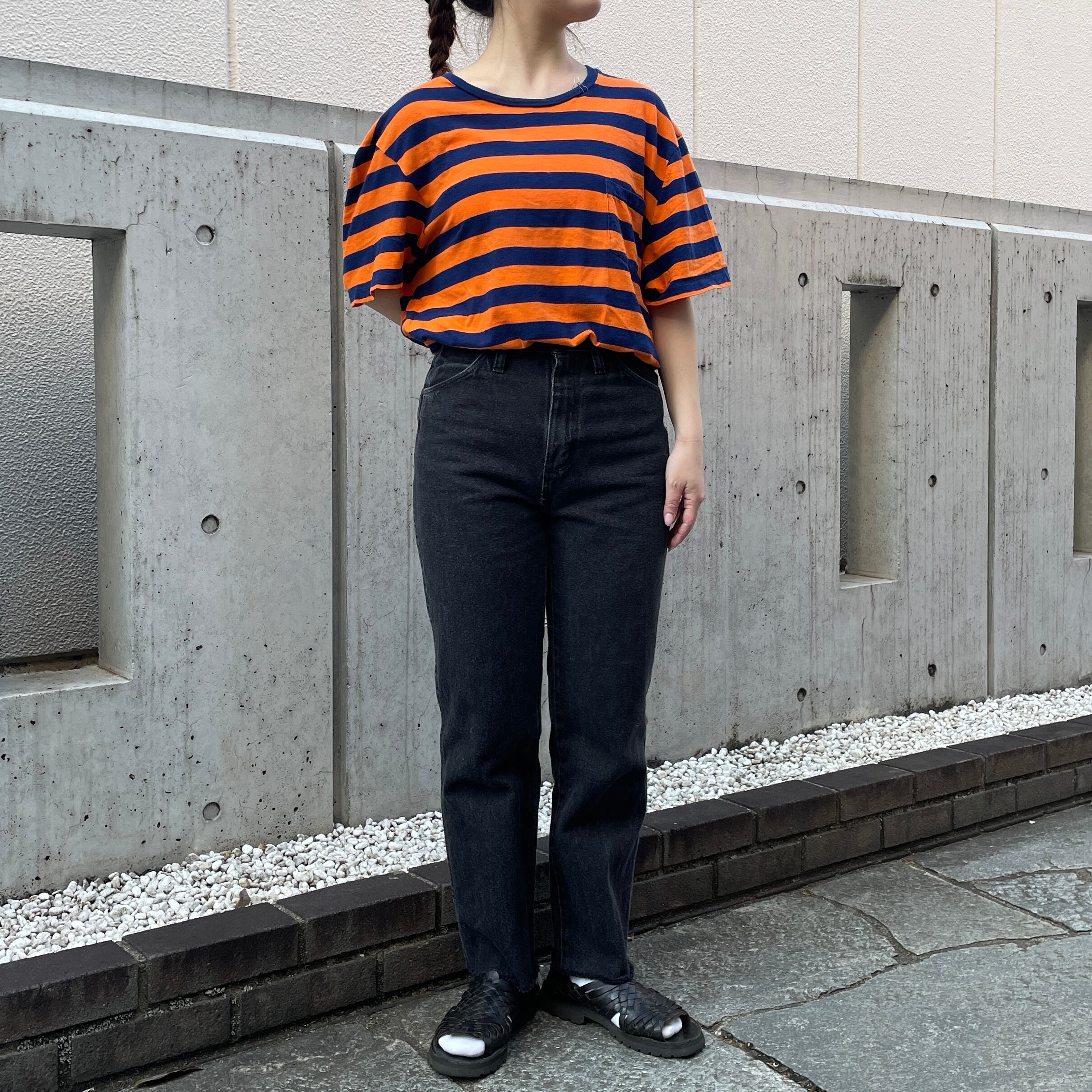 オレンジ×ネイビーのボーダー柄Tシャツ。