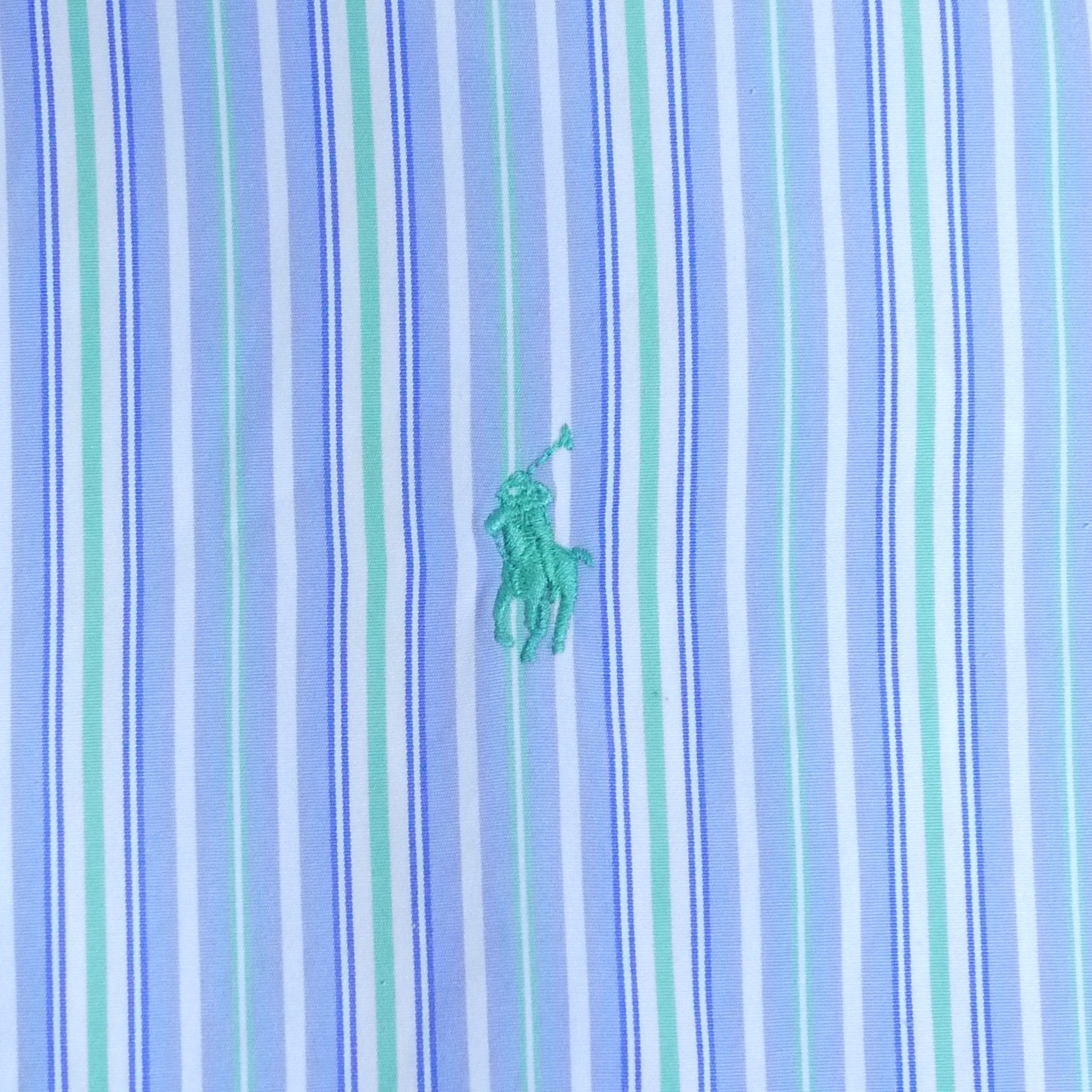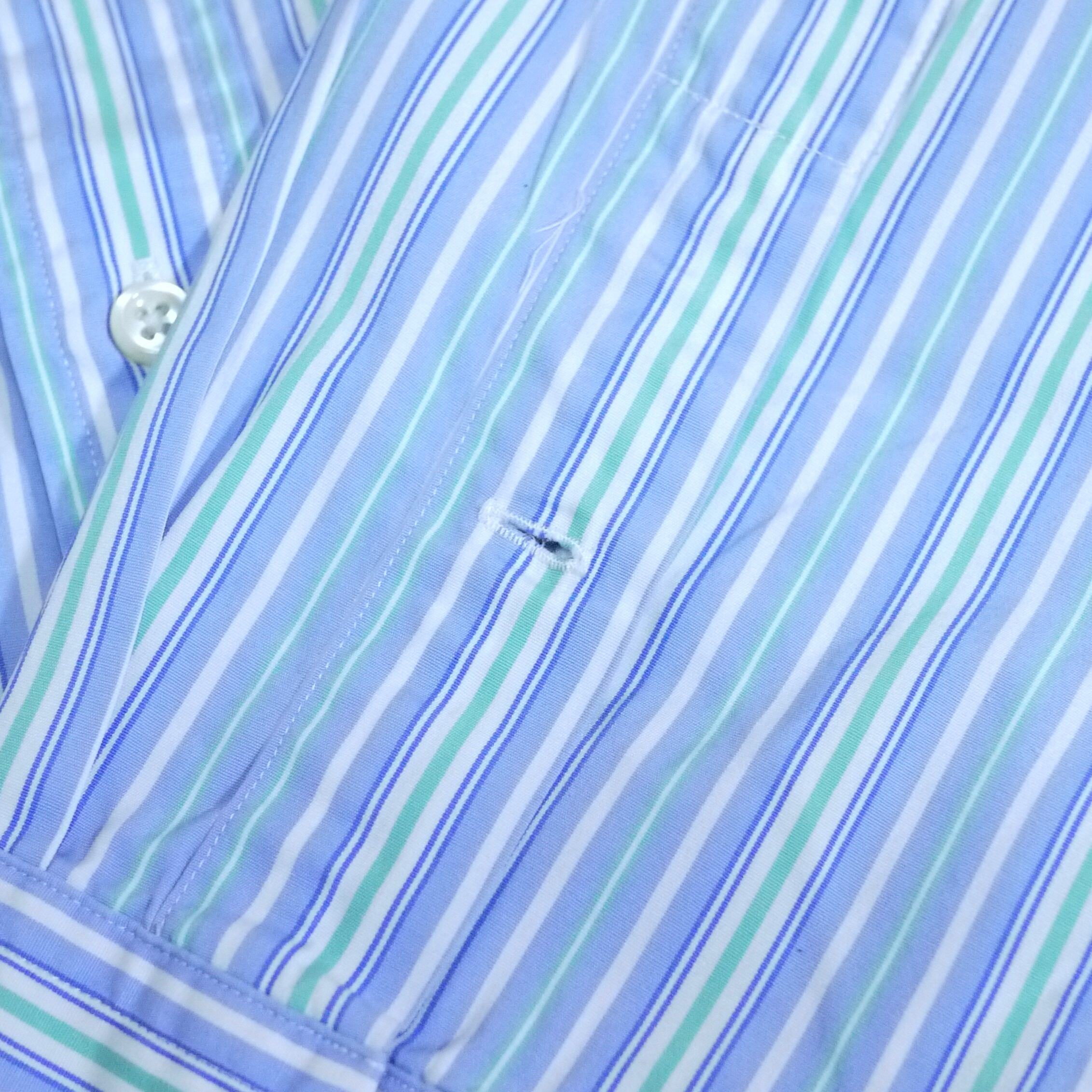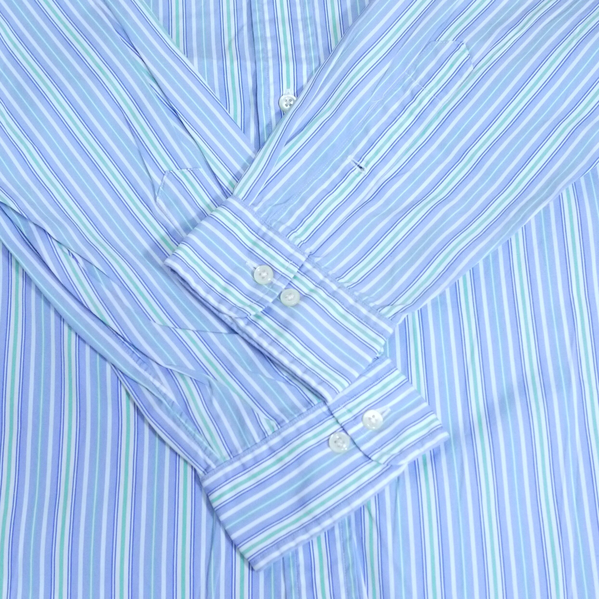 ブルー、グリーン、ホワイトのストライプ柄B.D.シャツ。