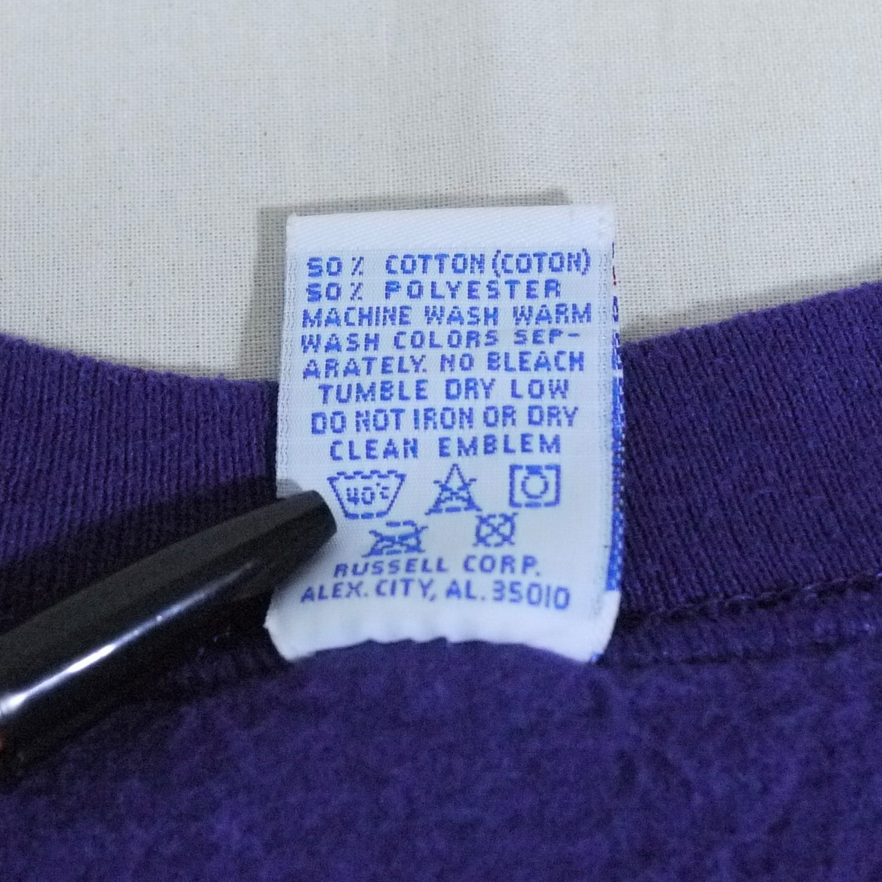 アメリカ製。ポリエステル50%、コットン50%。