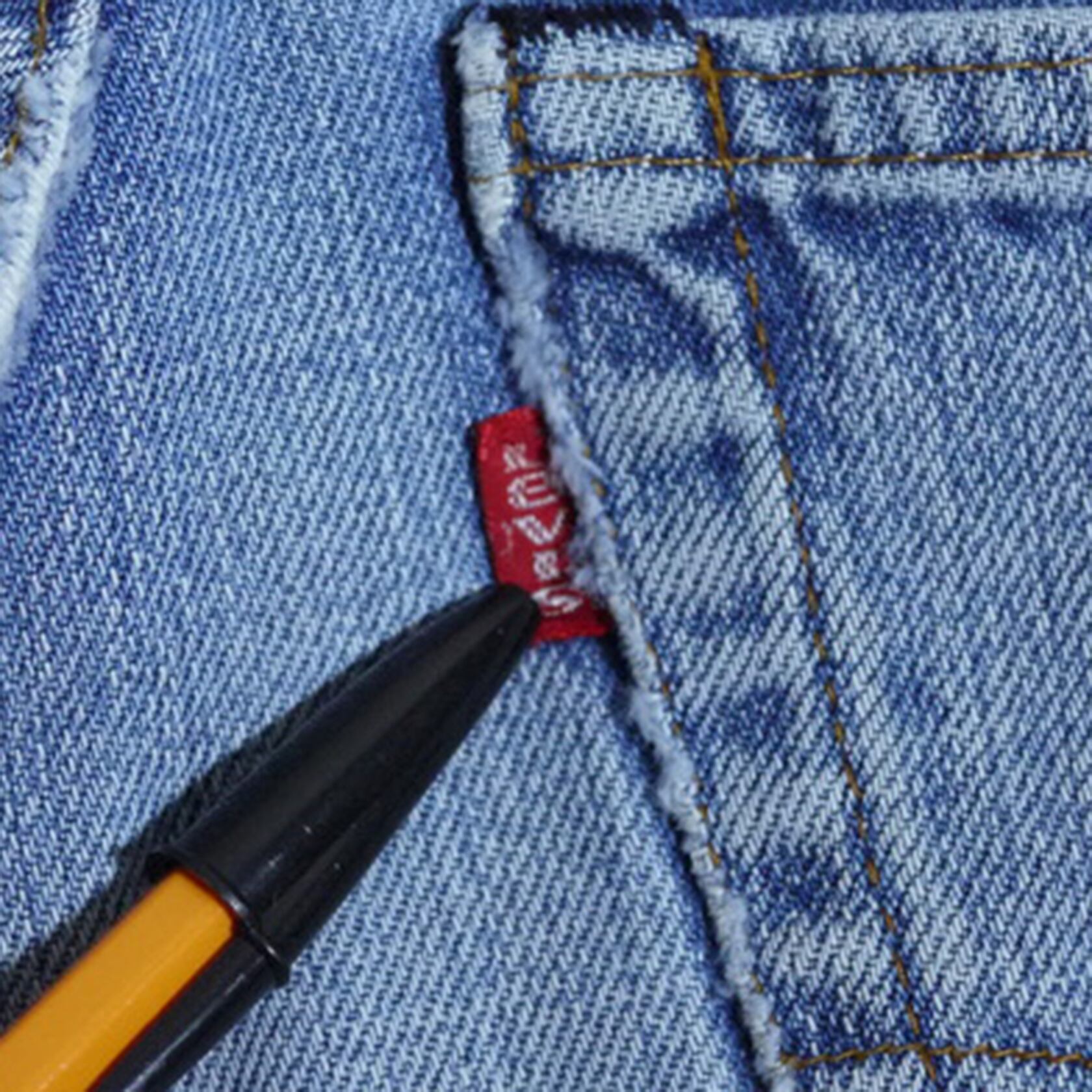 アメリカ製。コットン100%。赤タブスモールe。トップボタン裏の刻印8。黒カンヌキ。内股シングル。バックポケット裏シングル。ジッパーは42TALON。