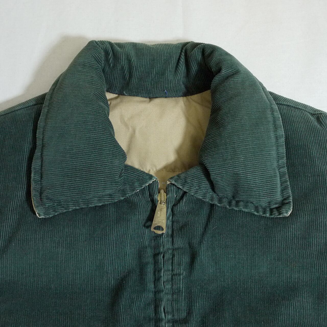 ダークグリーンカラーのコーデュロイ地のダウンベスト。