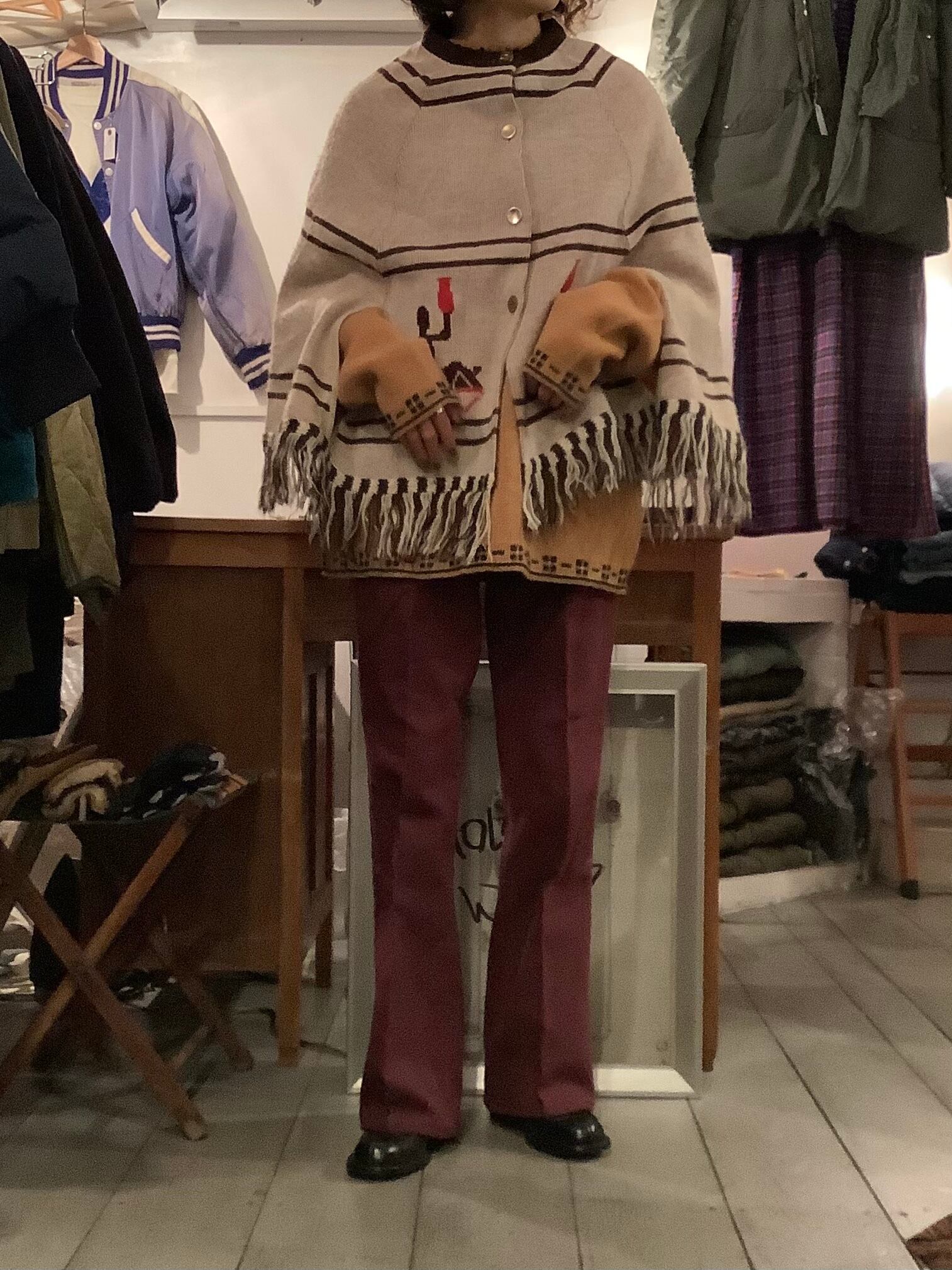 普段w26〜w27のデニムを着用しているのですが、こちらは若干余る程度でしたがベルトは必要なサイズ感でした。パープルの色味と裾にかけて広がるフレアシルエット、センタープレスが上品な印象にしてくれて履くだけでこなれ感が出ます!