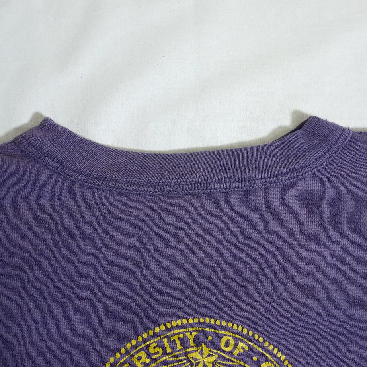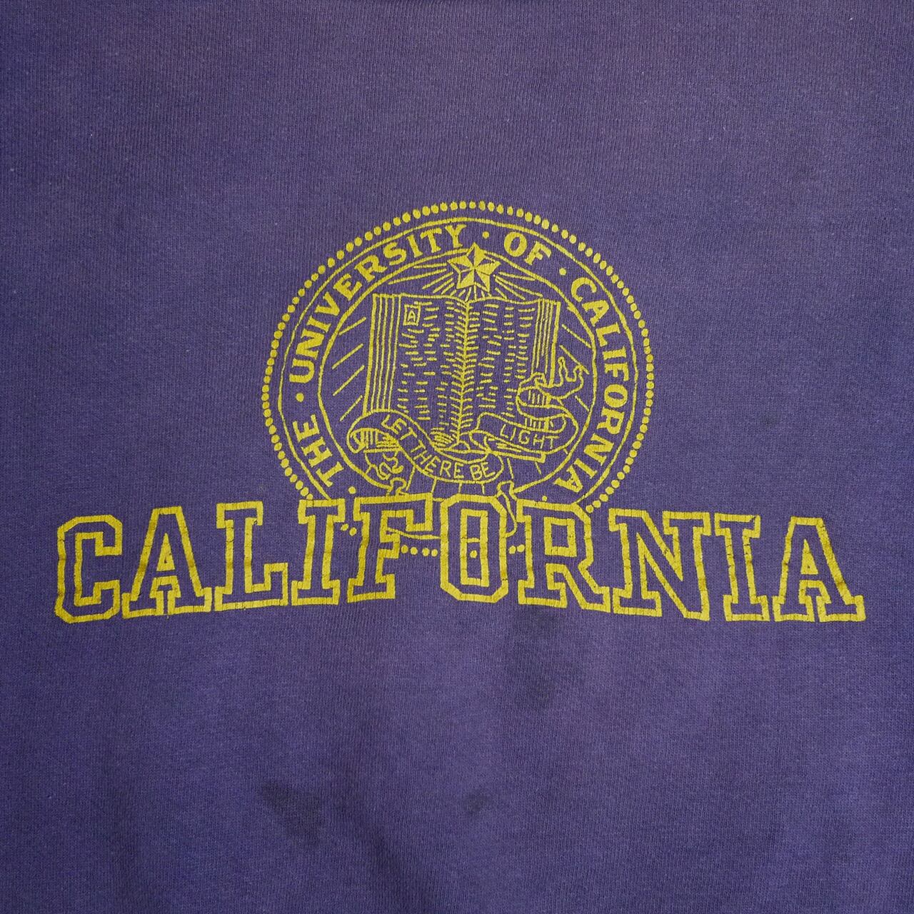 フェードしたネイビーカラーのボディにイエローのカレッジらしいプリント。