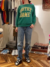 明るいグリーンカラーのボディにカレッジプリントのスウェット。