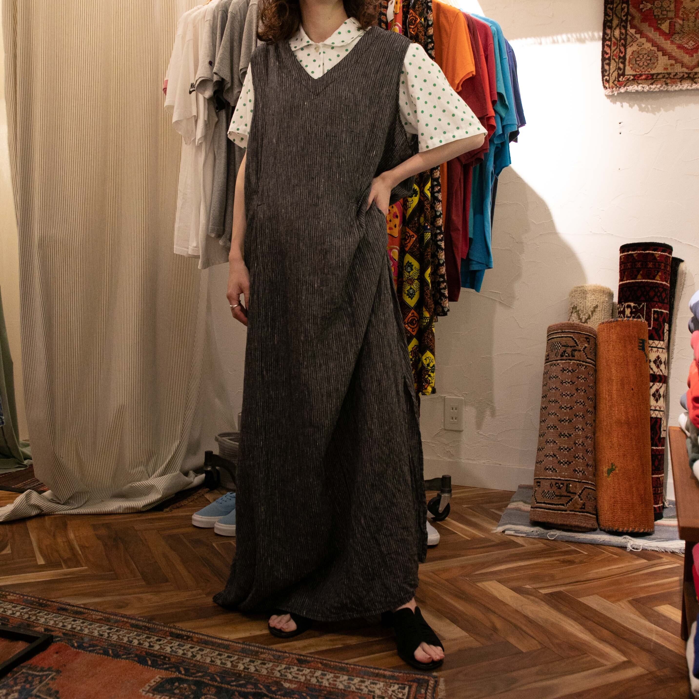 ブラックカラーをベースにしたランダムなピンストライプ柄のワンピース。